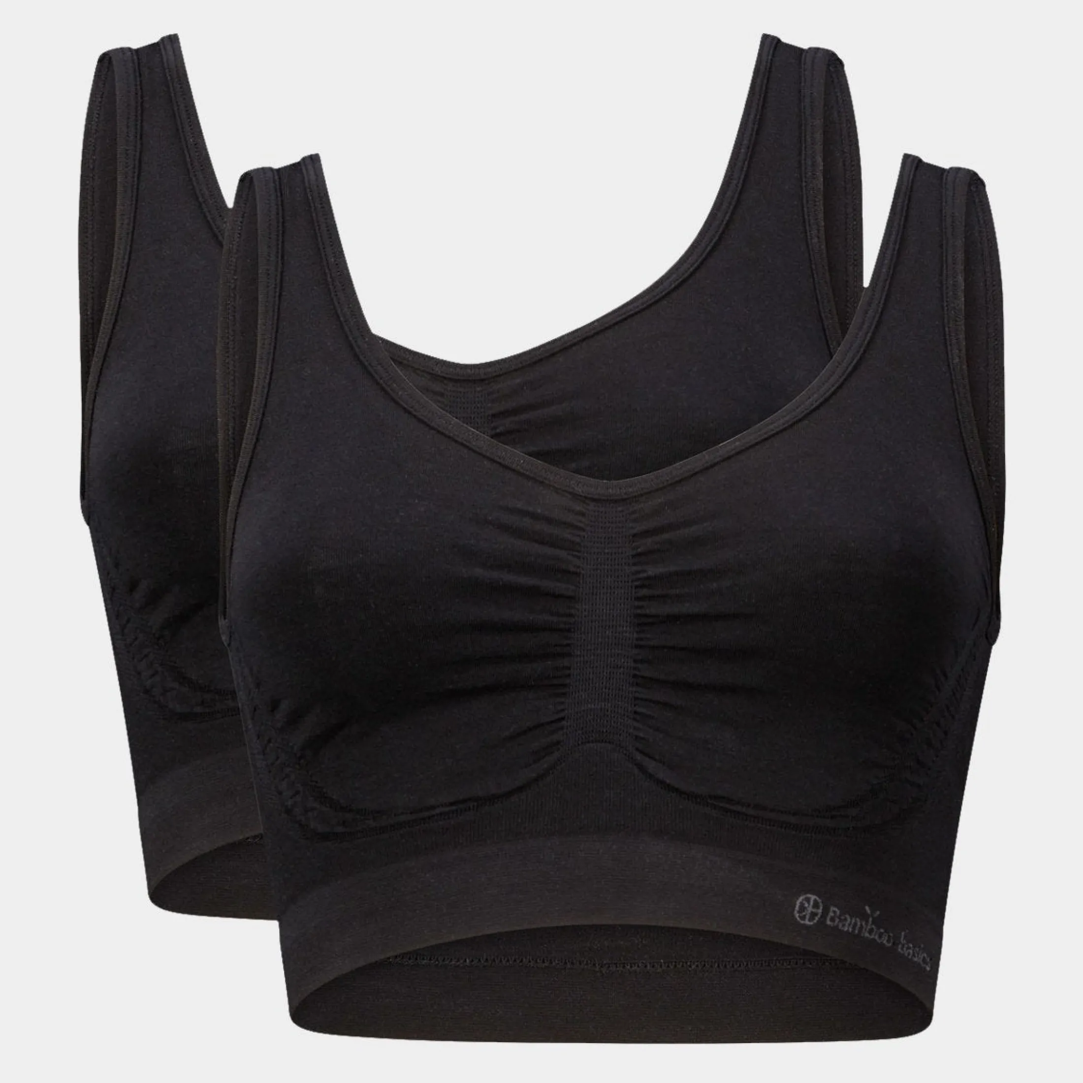 2 stk. super bløde sorte bambus BH uden bøjle og uden polstring, og med brede stropper. Linningen er vævet i et med bh’en, der er inden sidesømme og udskæringerne har en smal påsyet, foldet kant. De bløde bambus fibre er åndbare og temperaturregulerende, hvilket gør materialet perfekt til BH’er.