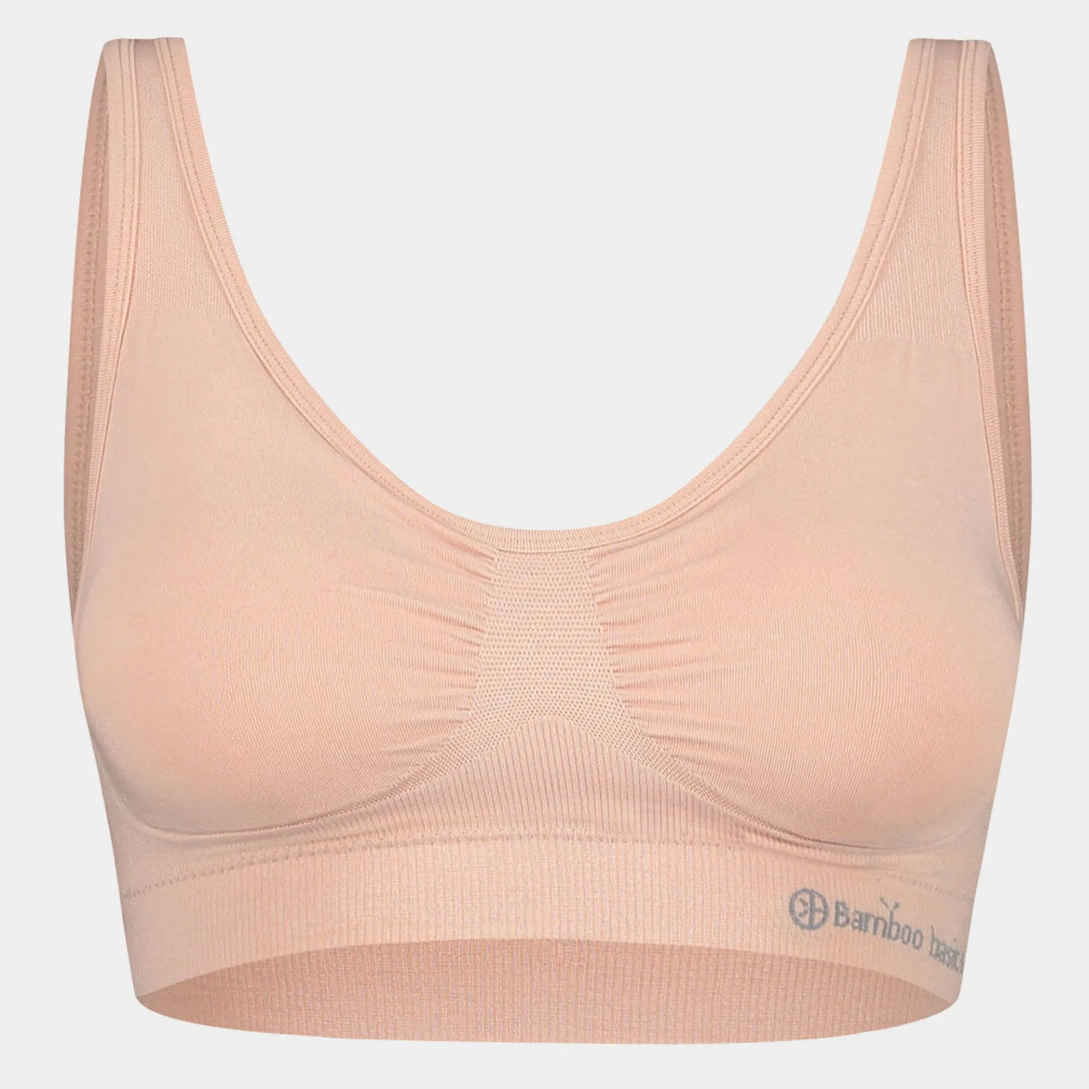 Super blød rose nude vatteret bambus BH uden bøjle, og med brede stropper. Linningen er vævet i et med bh’en, der er inden sidesømme og udskæringerne har en smal påsyet, foldet kant. De bløde bambus fibre er åndbare og temperaturregulerende, hvilket gør materialet perfekt til BH’er.