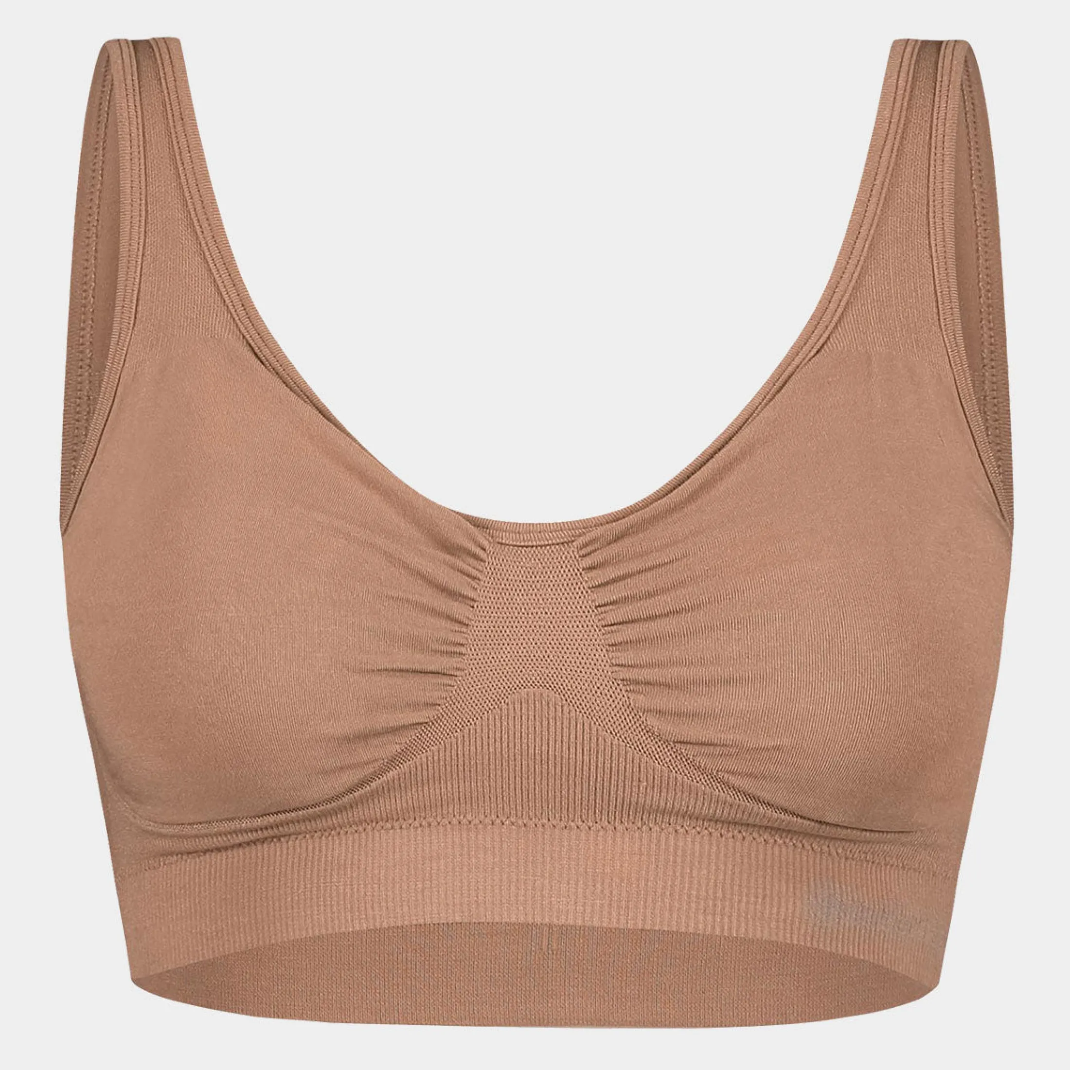 Super blød tan nude vatteret bambus BH uden bøjle, og med brede stropper. Linningen er vævet i et med bh’en, der er ingen sidesøm og udskæringerne har en smal påsyet, foldet kant. De bløde bambus fibre er åndbare og temperaturregulerende, hvilket gør materialet perfekt til BH’er.