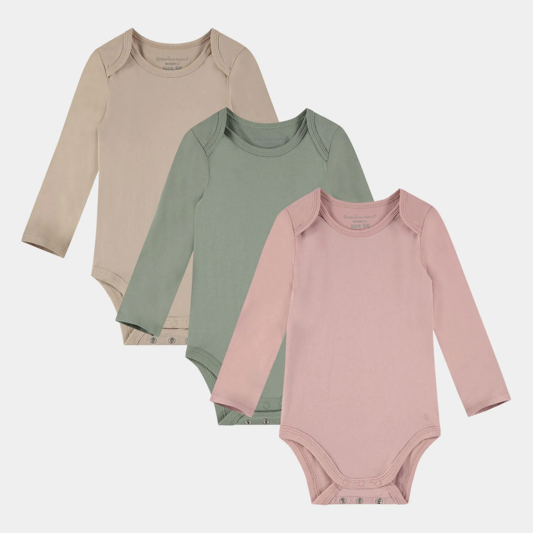 I denne pakke får du 1x lyserød, 1x grøn og 1x beige langærmet body.