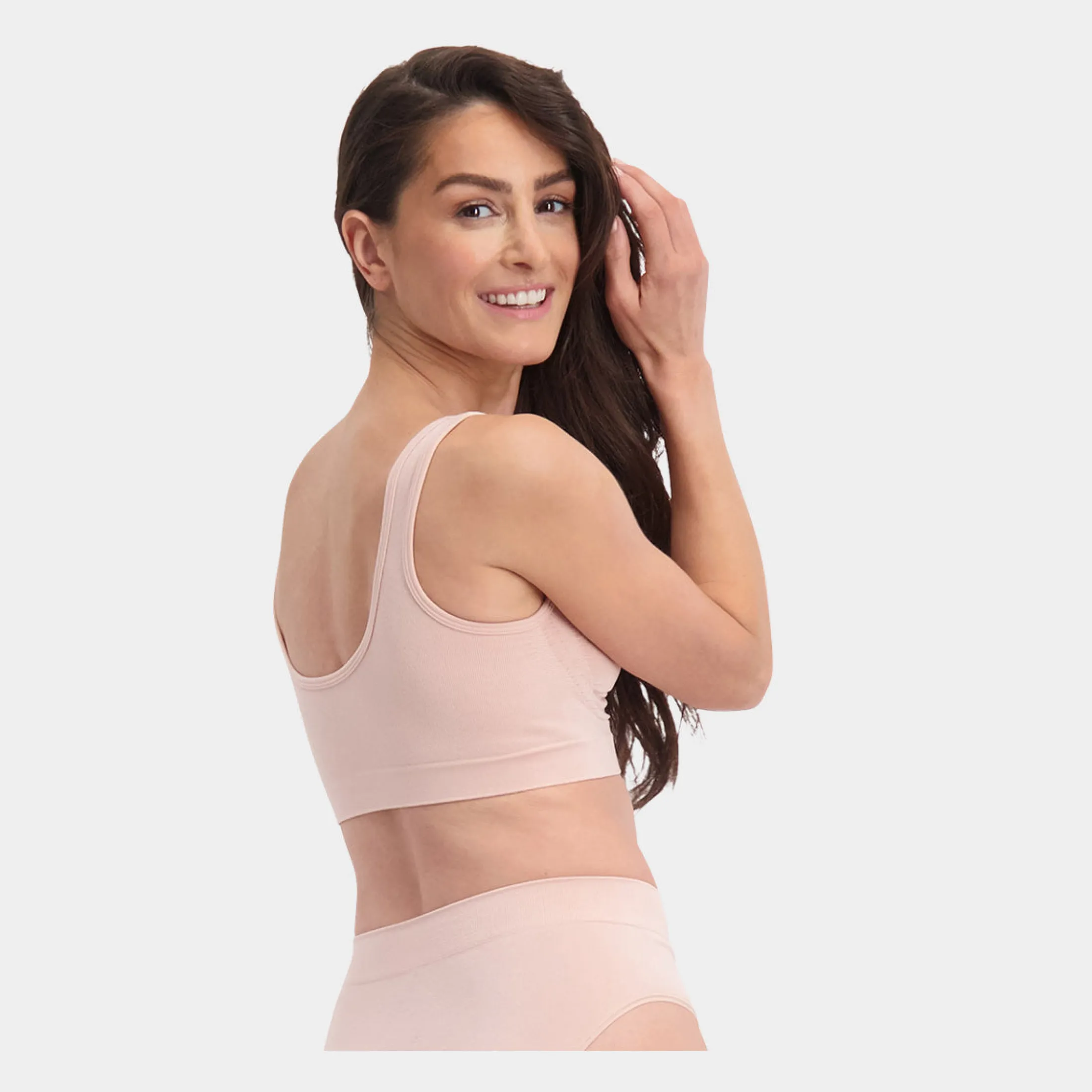 2 stk. super bløde rose nude bambus BH uden bøjle og polstring, og med brede stropper. Linningen er vævet i et med bh’en, der er inden sidesømme og udskæringerne har en smal påsyet, foldet kant. De bløde bambus fibre er åndbare og temperaturregulerende, hvilket gør materialet perfekt til BH’er.