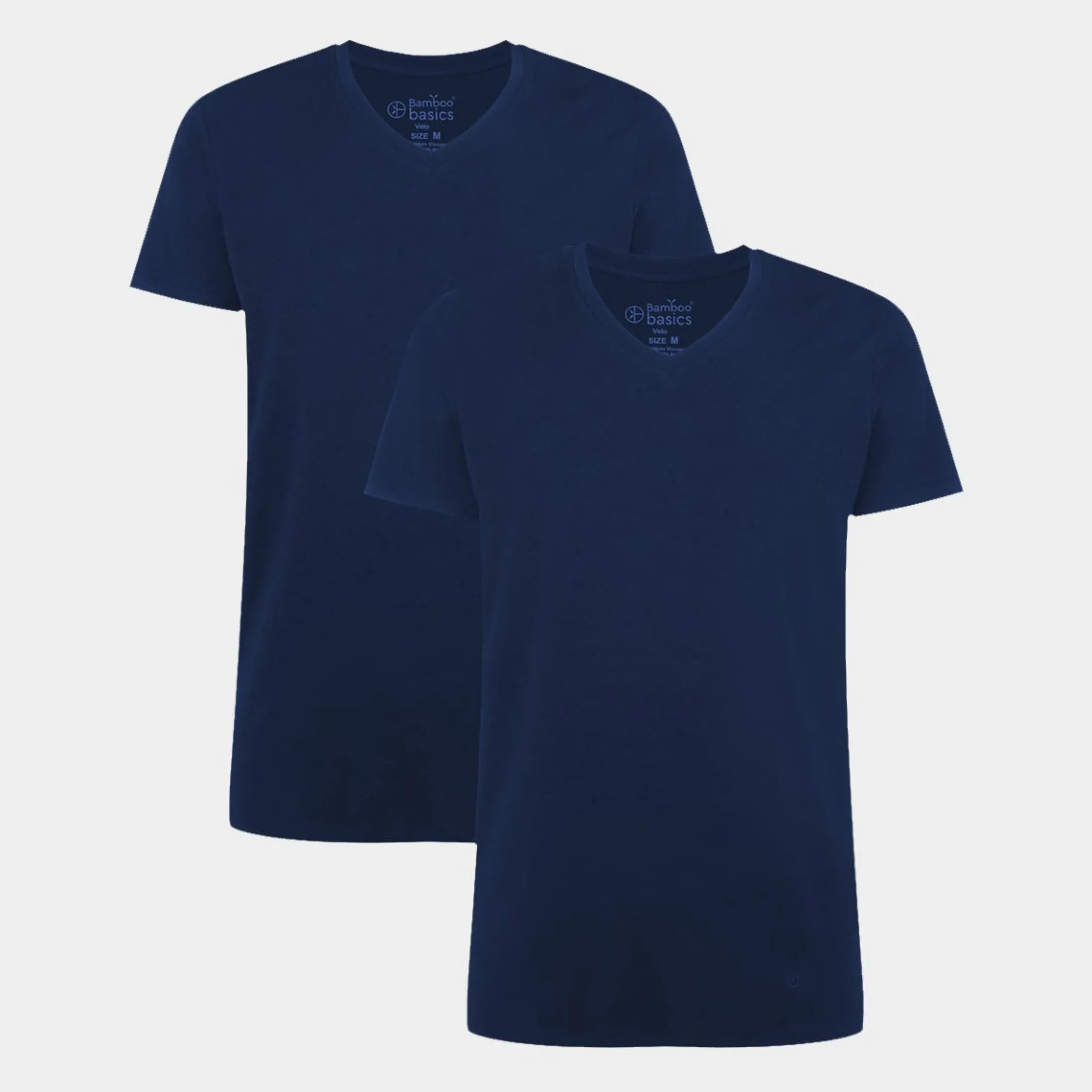 2 stk navy blå T-shirts med v-hals i bambus fra Bamboo Basics. Det silkebløde bambus gør T-shirten perfekt til brug under fx en skjorte, da den er åndbar, svedtransporterende og temperaturregulerende.