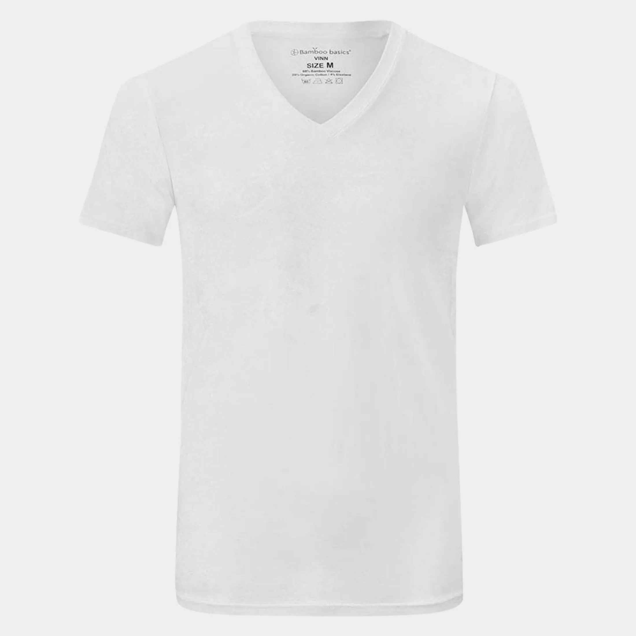 2 hvide bambus t-shirts i slimfit med v-hals til herre fra Bamboo Basics. Den dybe v-hals gør t-shirten perfekt til at have under skjorten, hvor bambusmaterialet gør den temperaturregulerende og åndbar.
