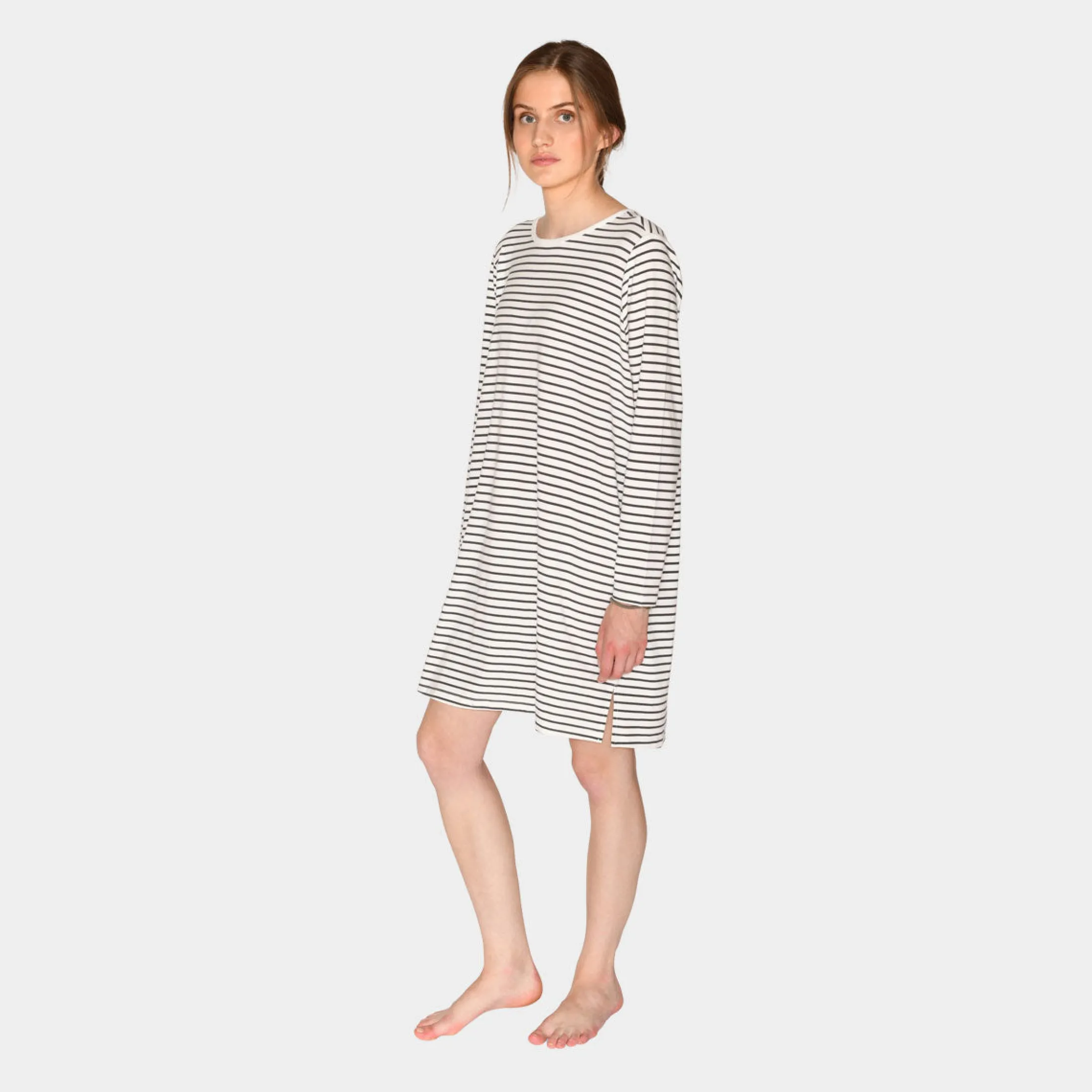 Denne flotte langærmede bambus natkjole i hvid med grå striber, er dejlig kraftig i kvaliteten. Perfekt til kølige nætter og hyggelige søndage hjemme. Bambus er åndbart og temperaturregulerende, hvilket gør det perfekt til at sove i uden at få det alt for varmt eller koldt.