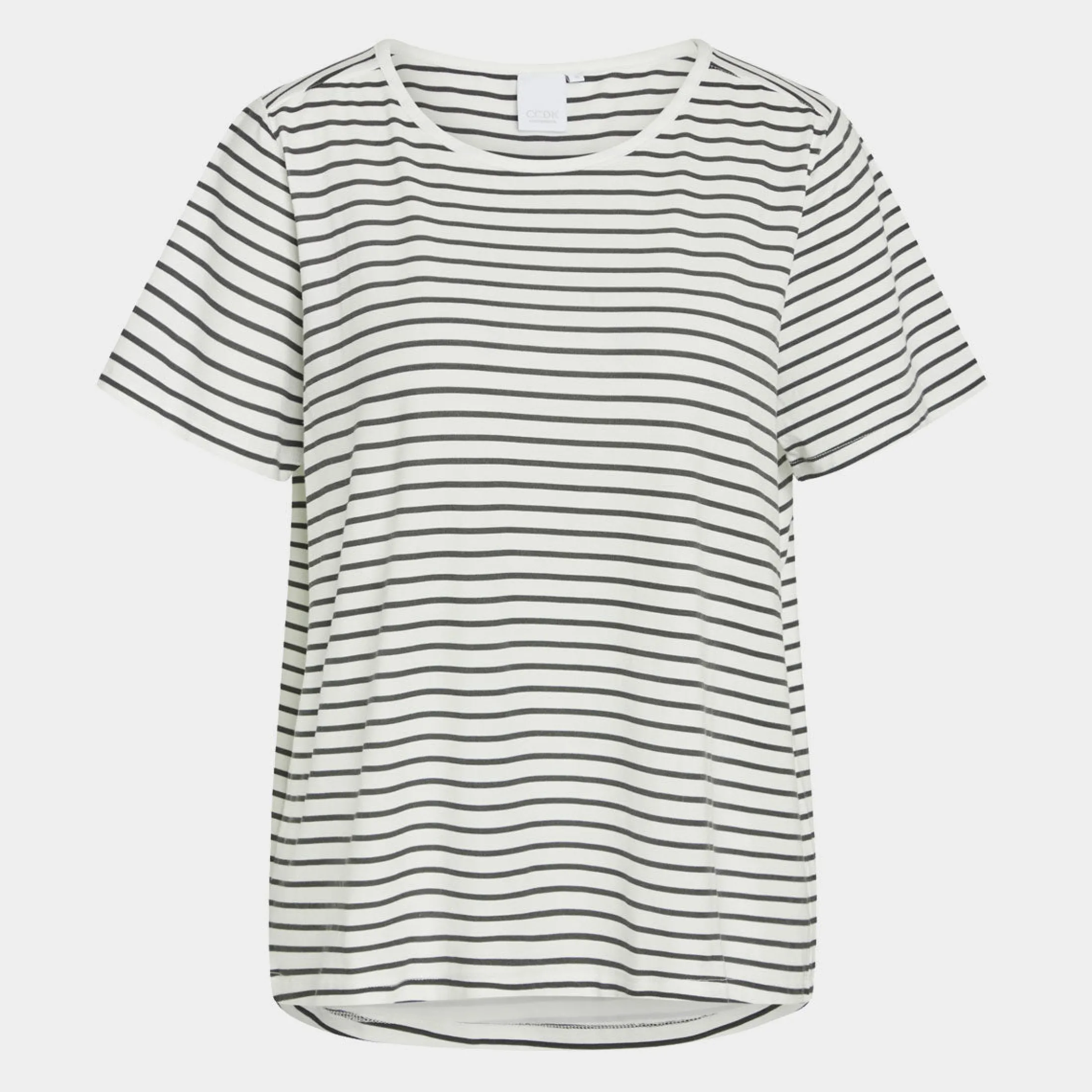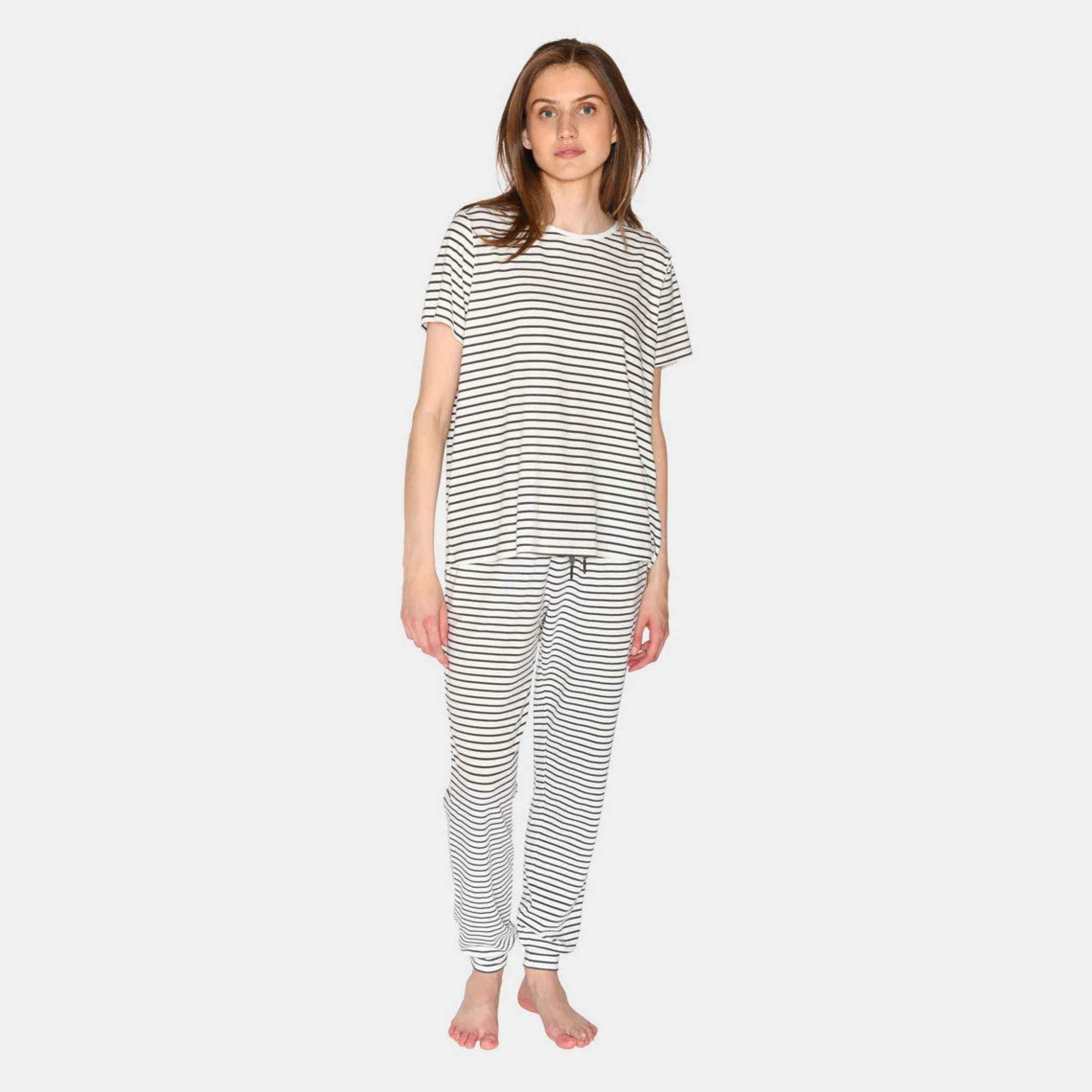 Denne kortærmede T-shirt fra CCDK er designet i en klassisk hvid med fine tyndere grå striber. Den er fremstillet af en lækker blanding af bambus og økologisk bomuld, som giver blødhed, åndbarhed og temperaturregulerende egenskaber. Et ideelt valg til din basisgarderobe; perfekt til afslapning eller en komfortabel nats søvn.