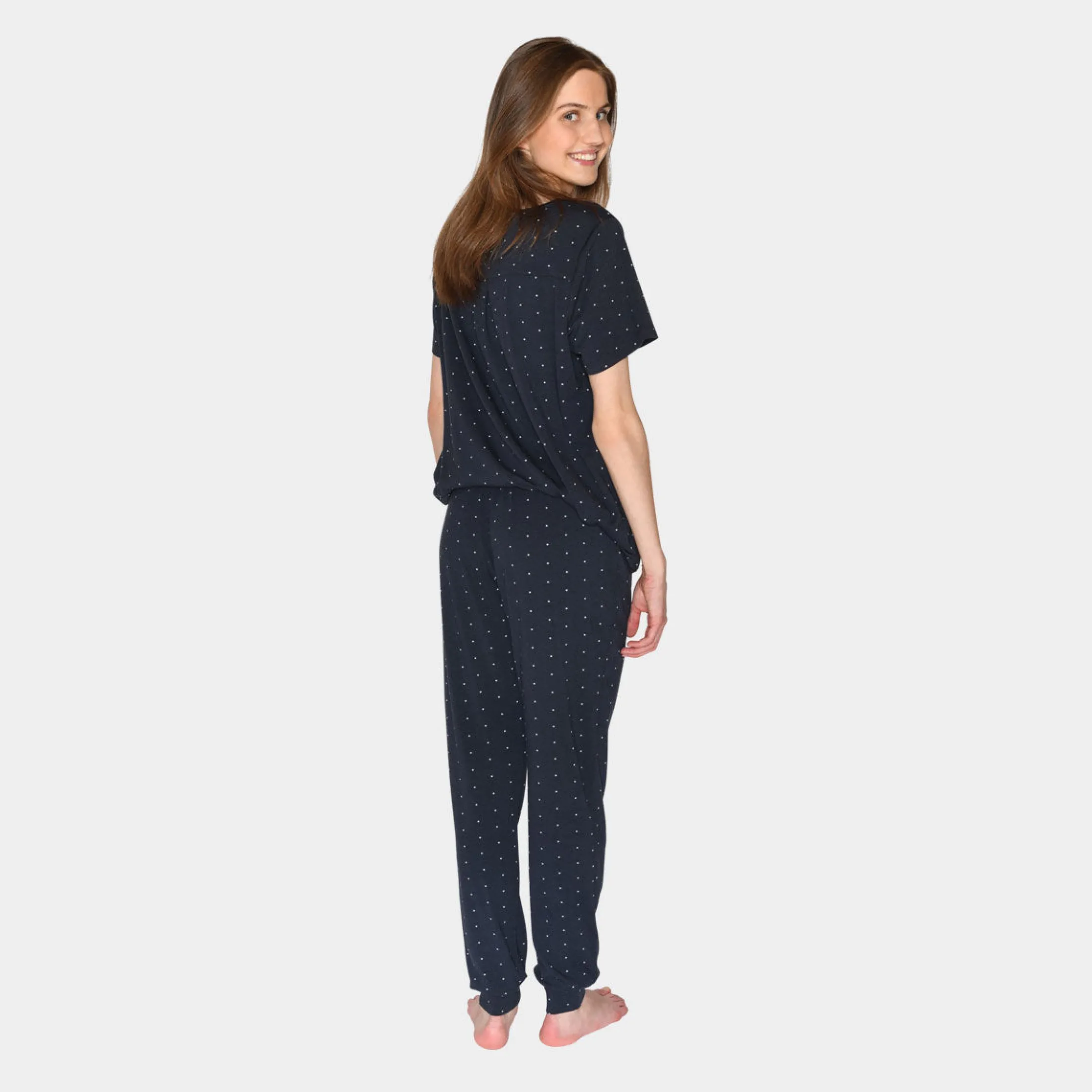 Denne kortærmede T-shirt fra CCDK er designet i en klassisk navy med fine små prikker. Den er fremstillet af en lækker blanding af bambus og økologisk bomuld, som giver blødhed, åndbarhed og temperaturregulerende egenskaber. Et ideelt valg til din basisgarderobe; perfekt til afslapning eller en komfortabel nats søvn.