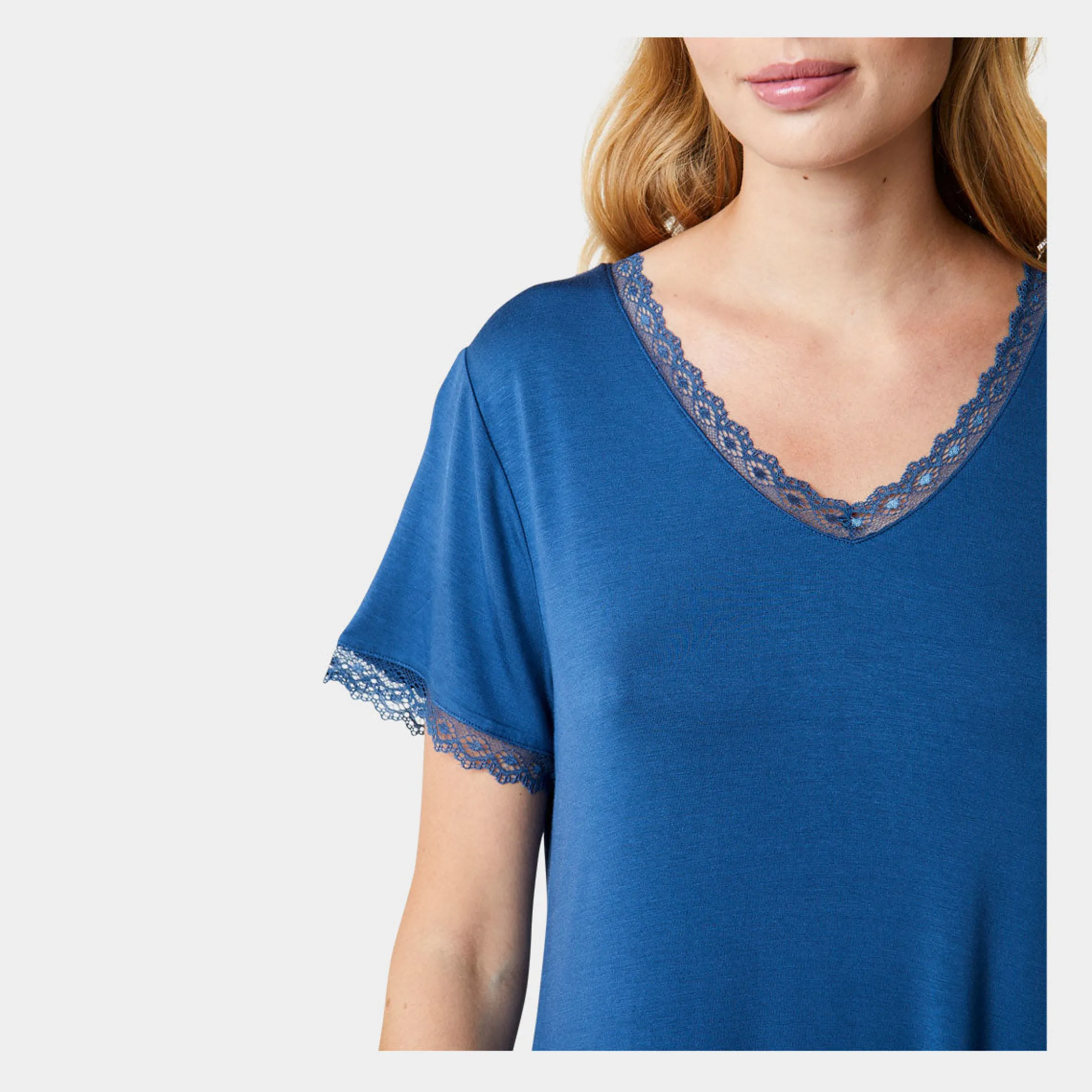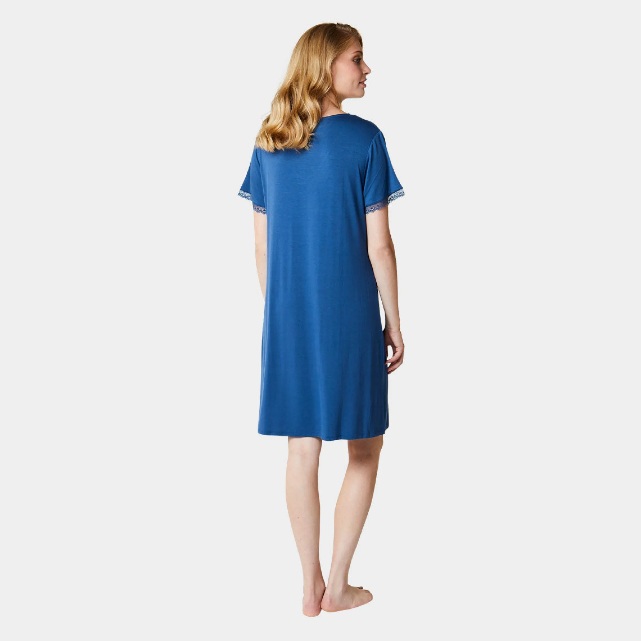 Feminin bambus natkjole med korte ærmer i støvet blå. Natkjolen har en v-hals udskæring med en smal blondekant samt en smal blondekant på begge ærmer.