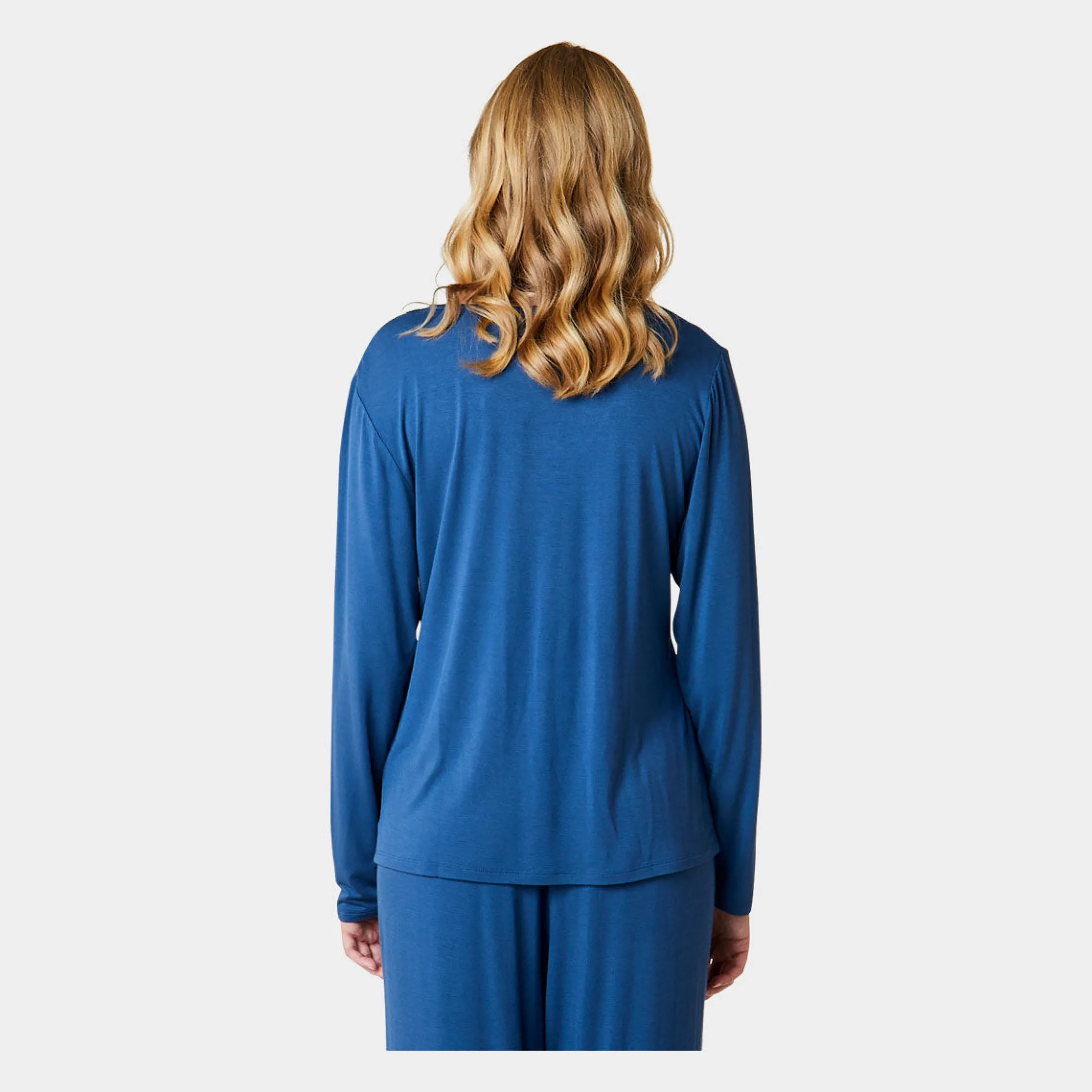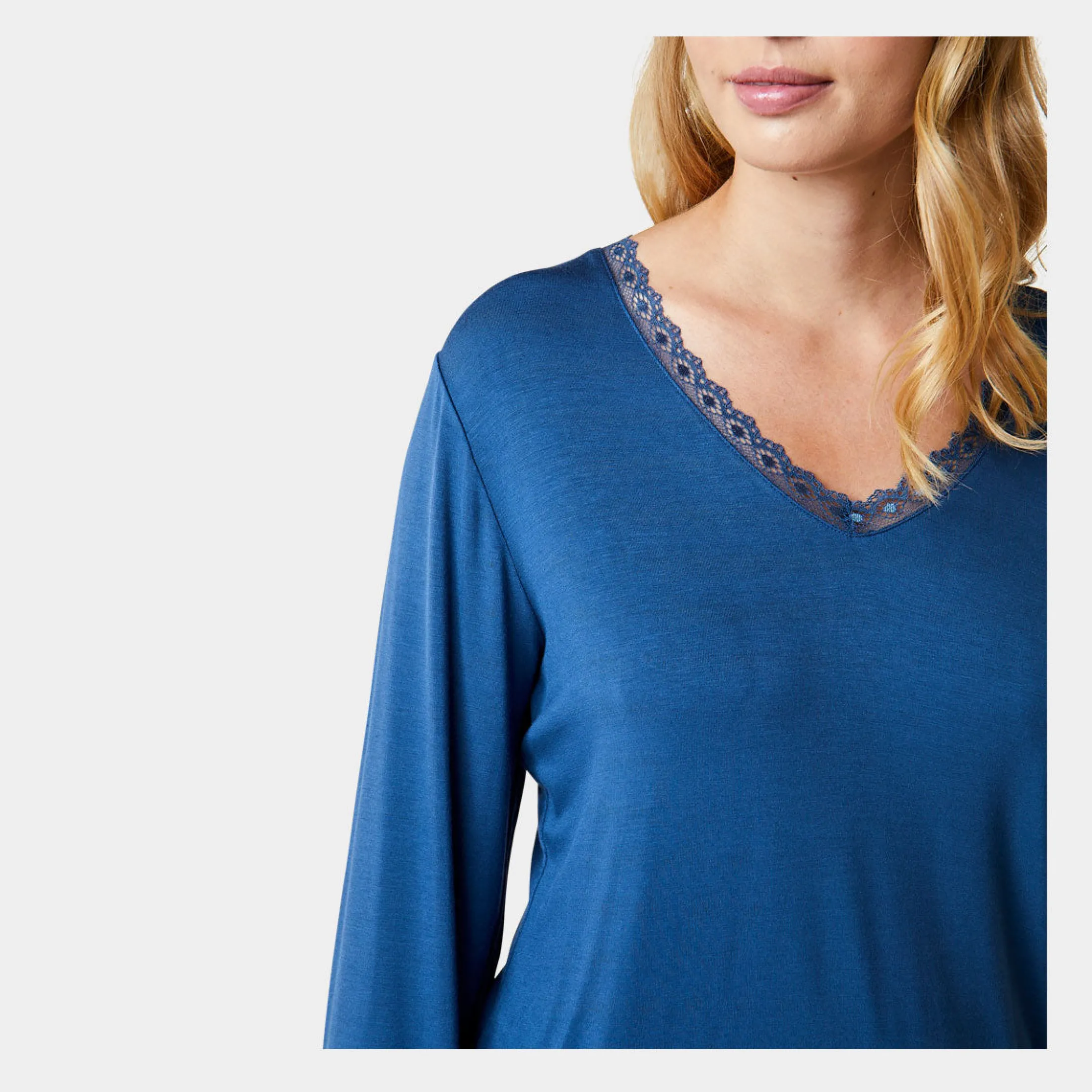Feminin bambus nattrøje med lange ærmer, i støvet blå. Nattrøjen har en v-hals udskæring med en smal blondekant.