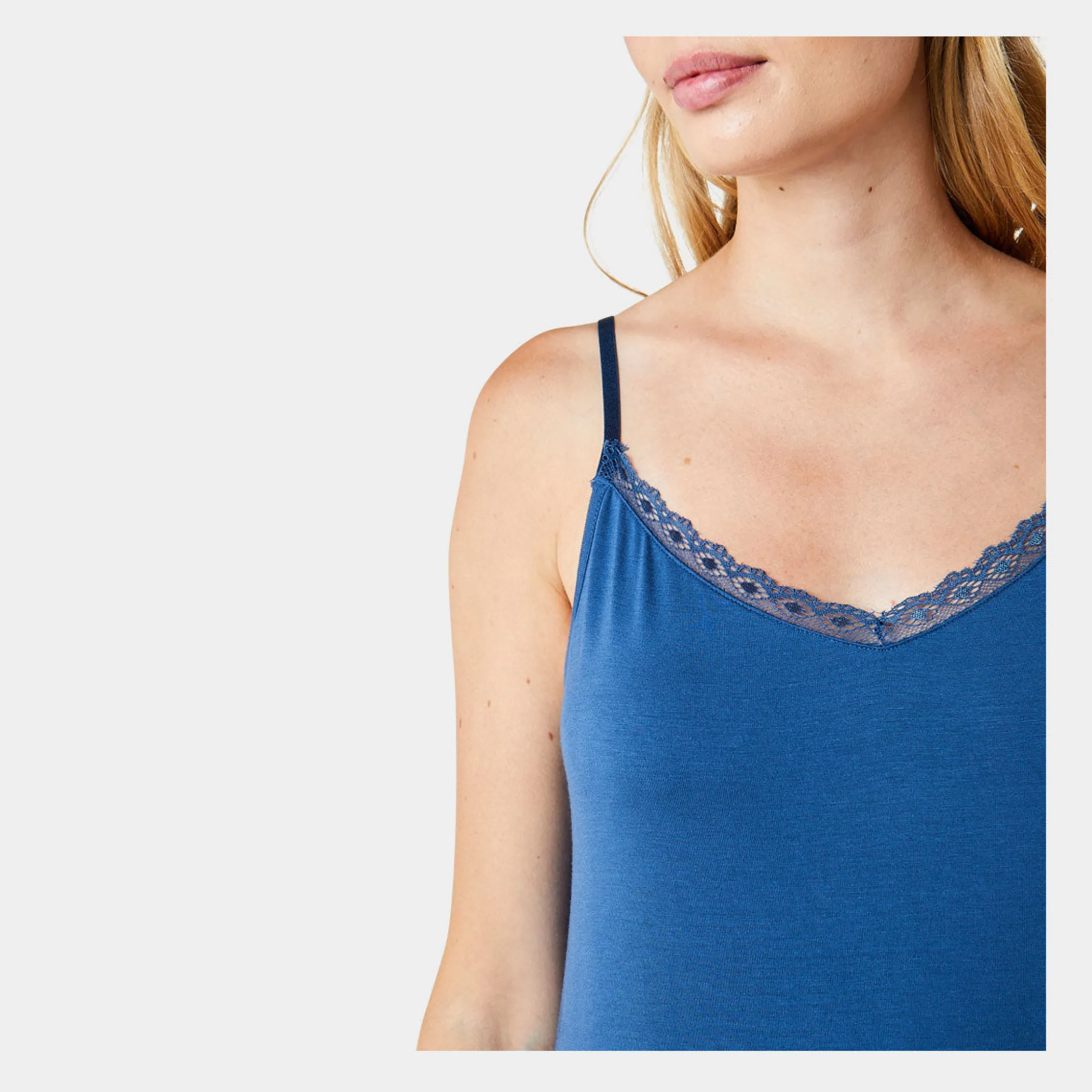 Feminin bambus natkjole i støvet blå. Natkjolen har smalle stropper samt v-hals udskæring med en smal blondekant.