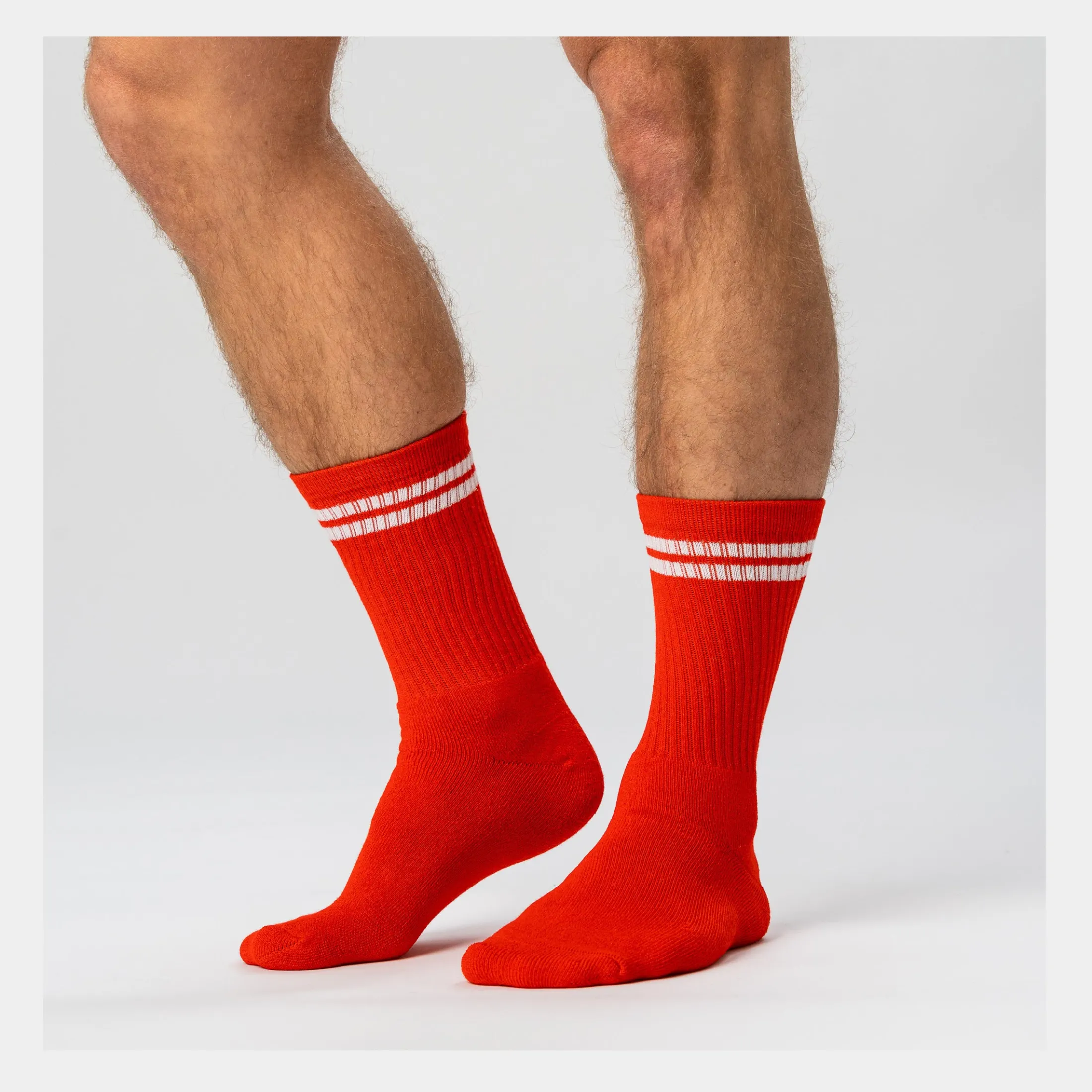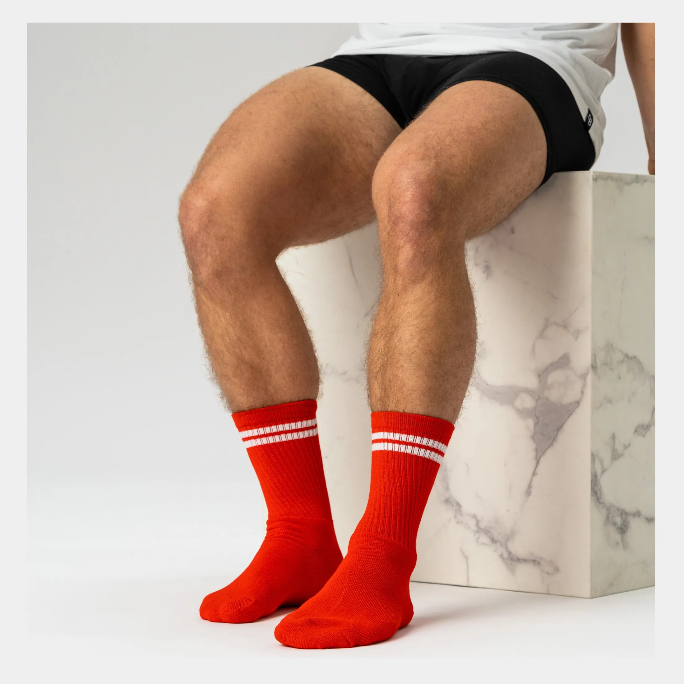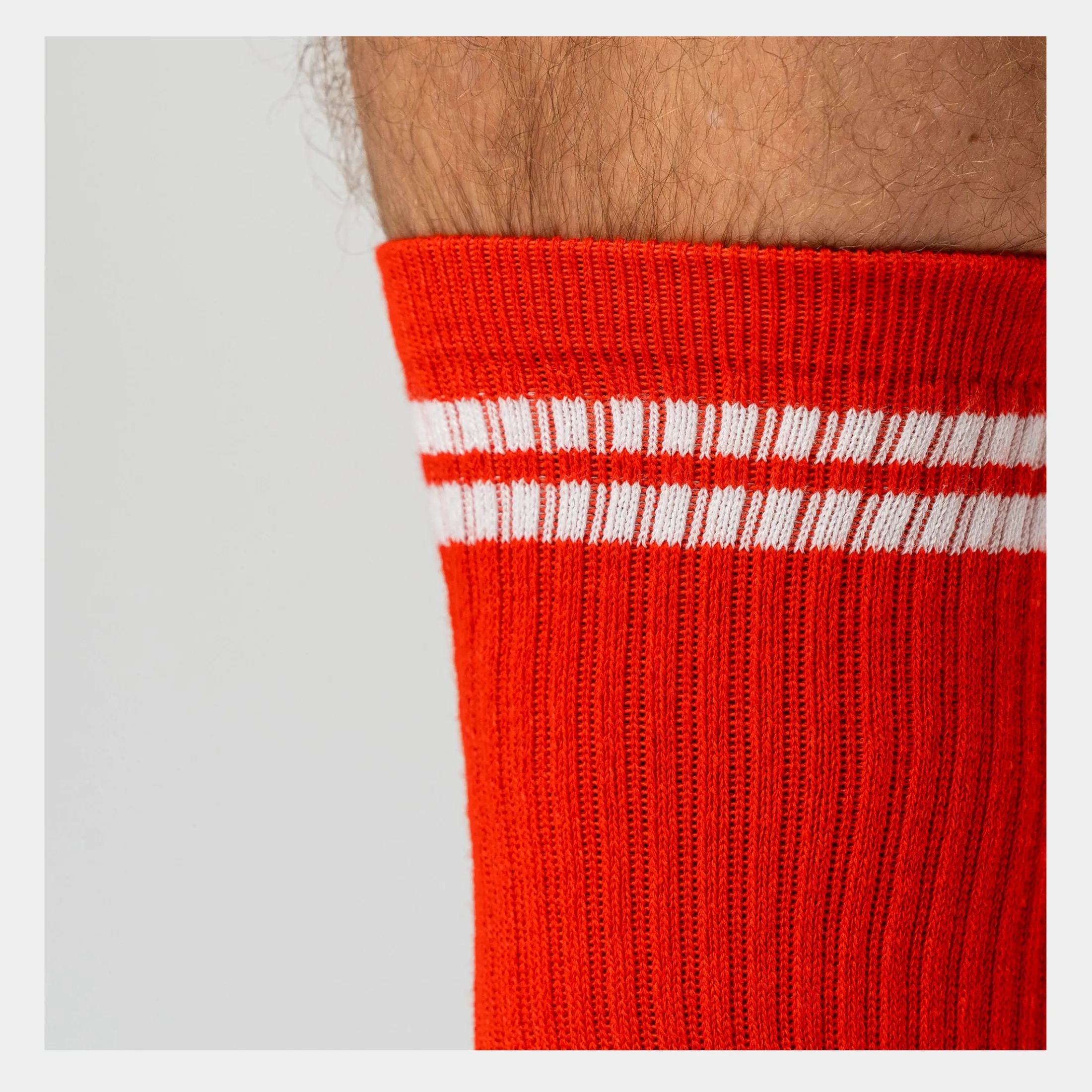 Disse røde tennisstrømper med hvide striber til herre og drenge fra Copenhagen Bamboo er fantastisk bløde fordi de er fremstillet af bambus. De er specielt velegnede til folk der er på fødderne hele dagen, da undersiden af foden er vævet ekstra tyk. Derudover er strømper af bambus bl.a. svedtransporterende og absorberende, så de holder dine fødder friske hele dagen.