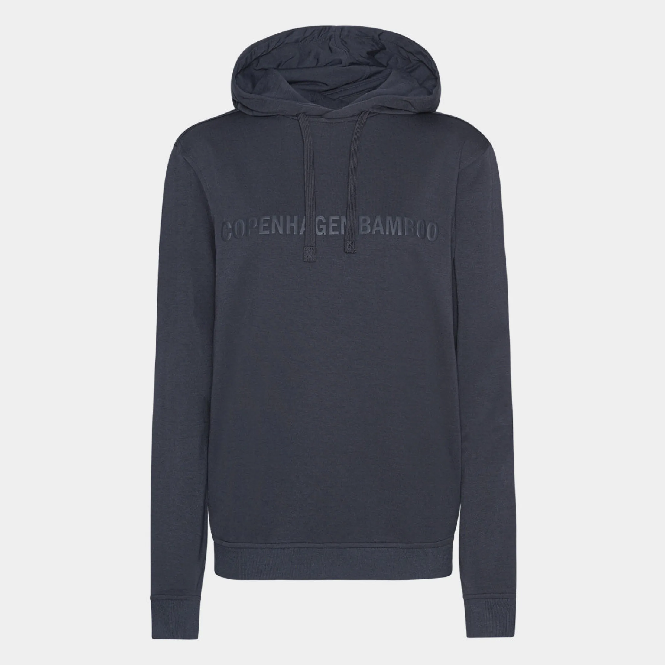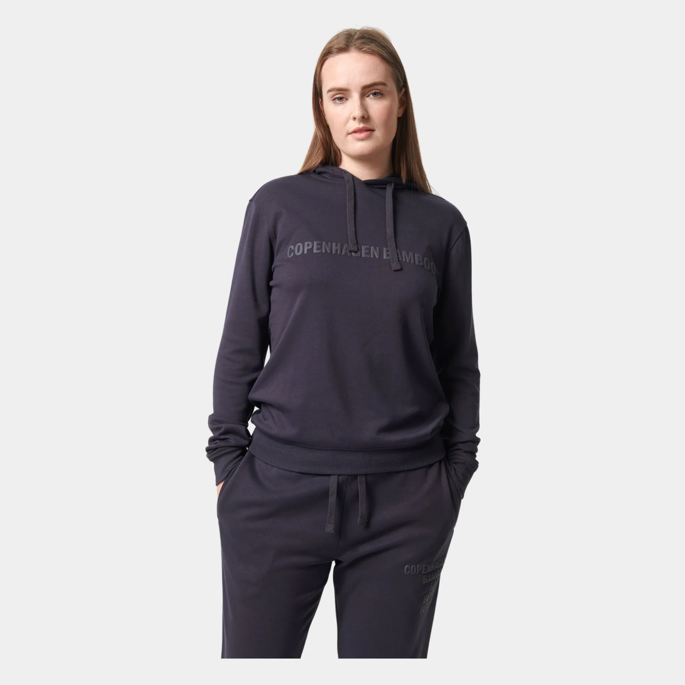 Flot mørkegrå bambus hoodie til kvinder med logo print hen over brystet. Denne hoodie er fremstillet i bambusviskose, økologisk bomuld og polyester.