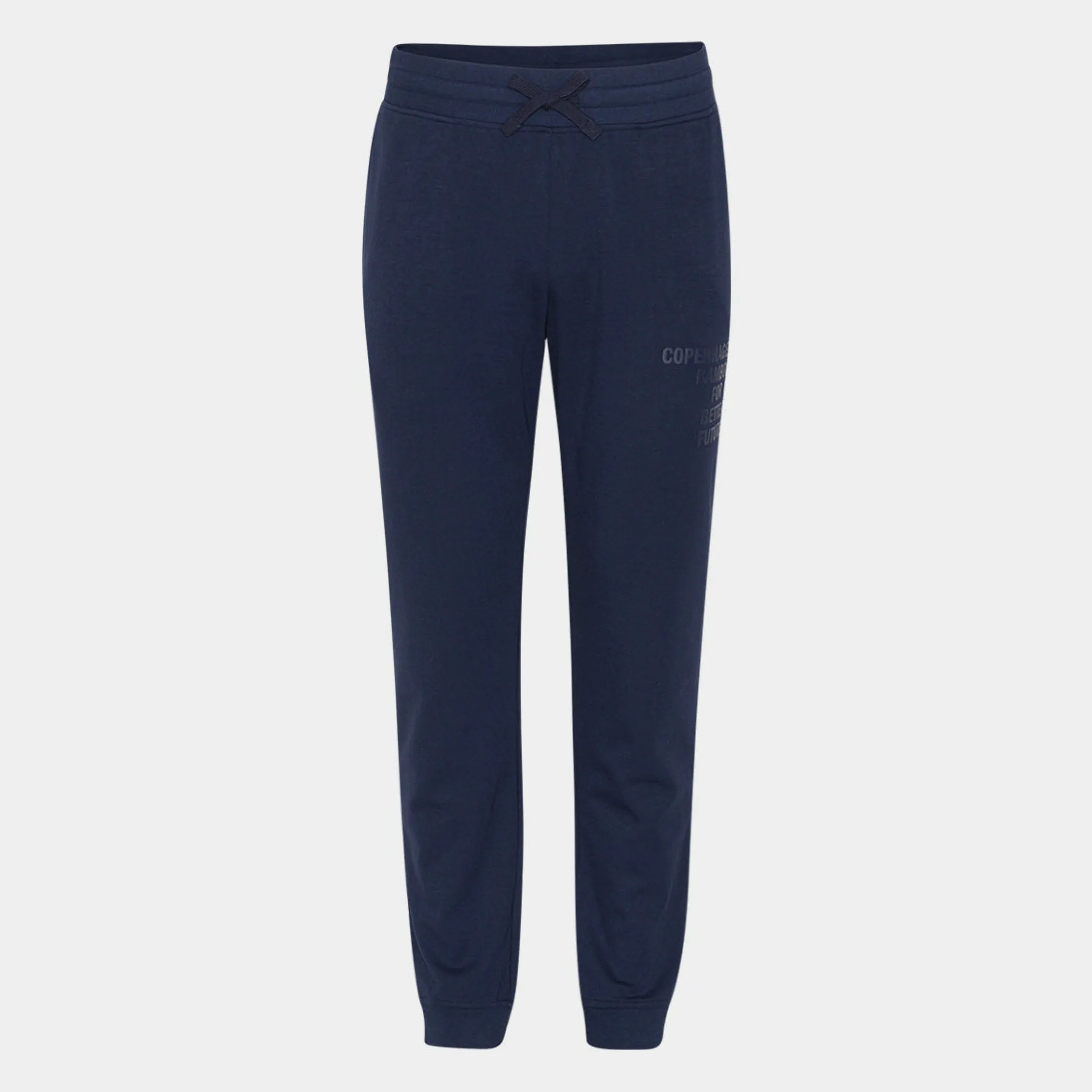 Bløde navyblå bambus sweatpants med logo på højre lår. Disse sweatpants har lynlås i lommerne, så du slipper for at pung og nøgler falder ud i løbet af dagen. De er fremstillet i bambusviskose, økologisk bomuld og polyester.