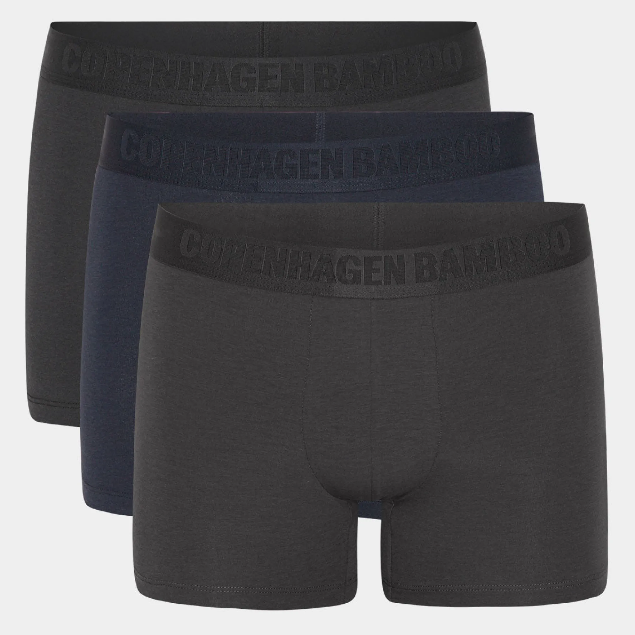 Denne 3 pak underbukser fra Copenhagen Bamboo indeholder 1 par sorte, 1 par navy og 1 par grå super bløde underbukser med syninger indvendigt på benene.