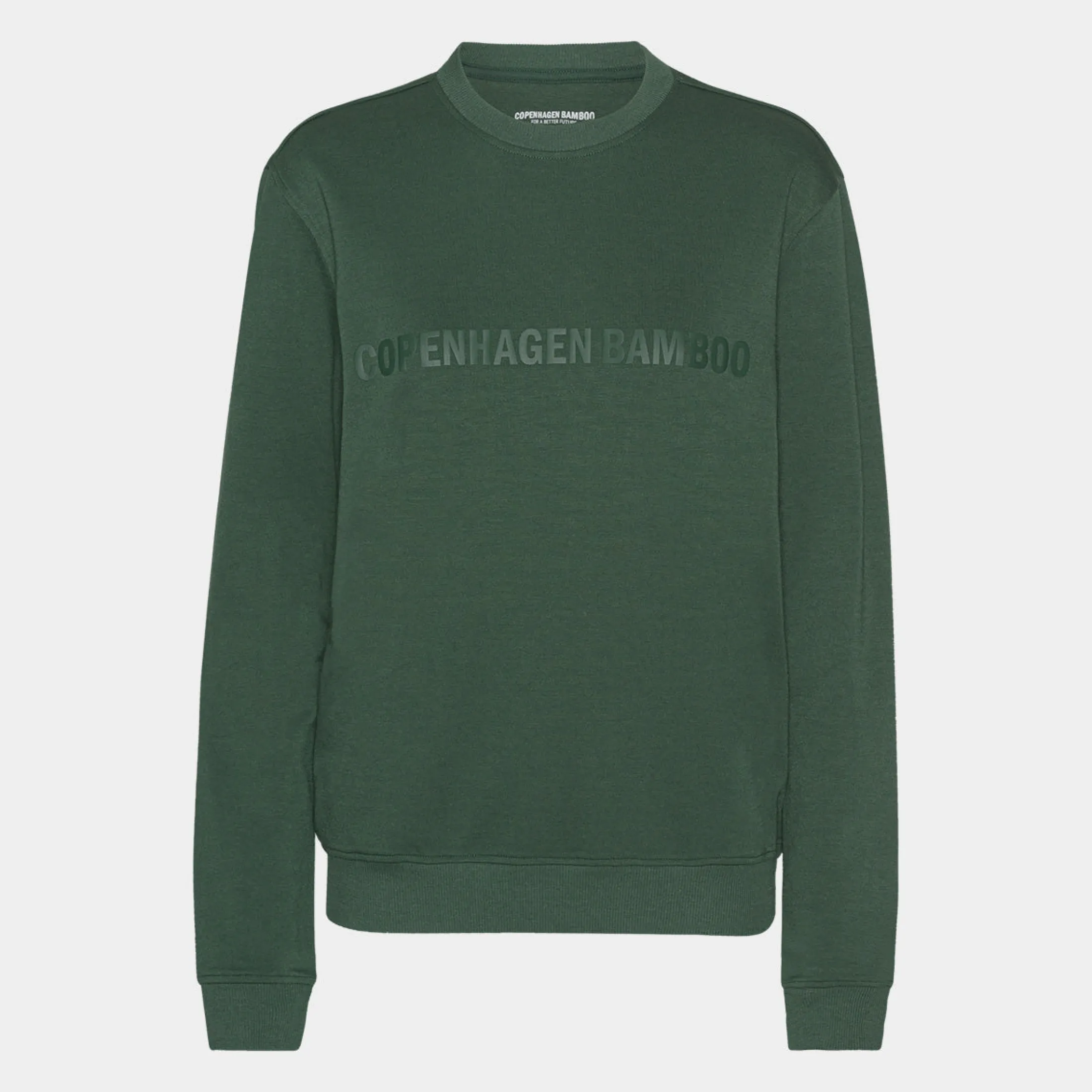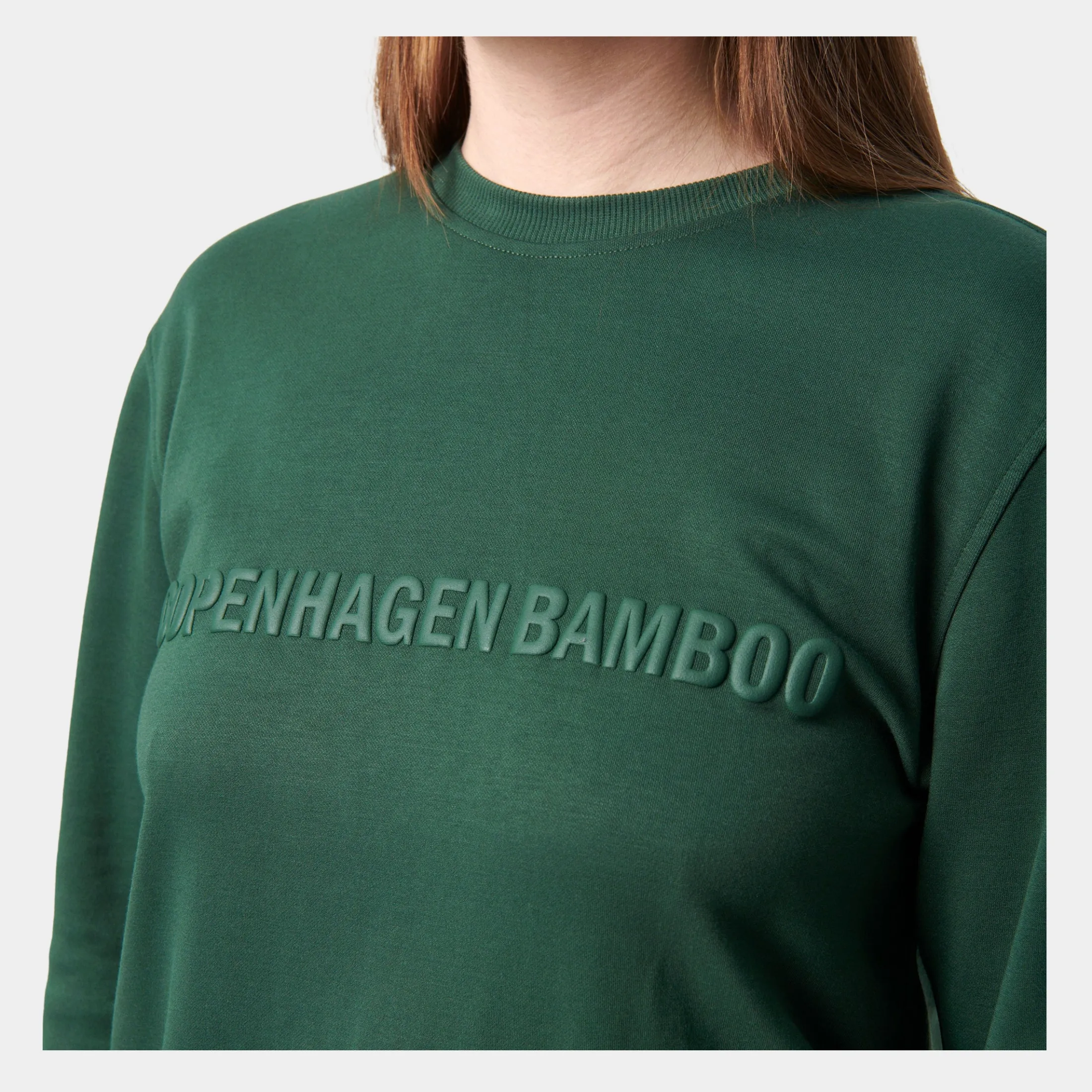 Flot grøn bambus sweatshirt til kvinder med logo print hen over brystet. Denne sweatshirt er fremstillet i bambusviskose, økologisk bomuld og polyester.