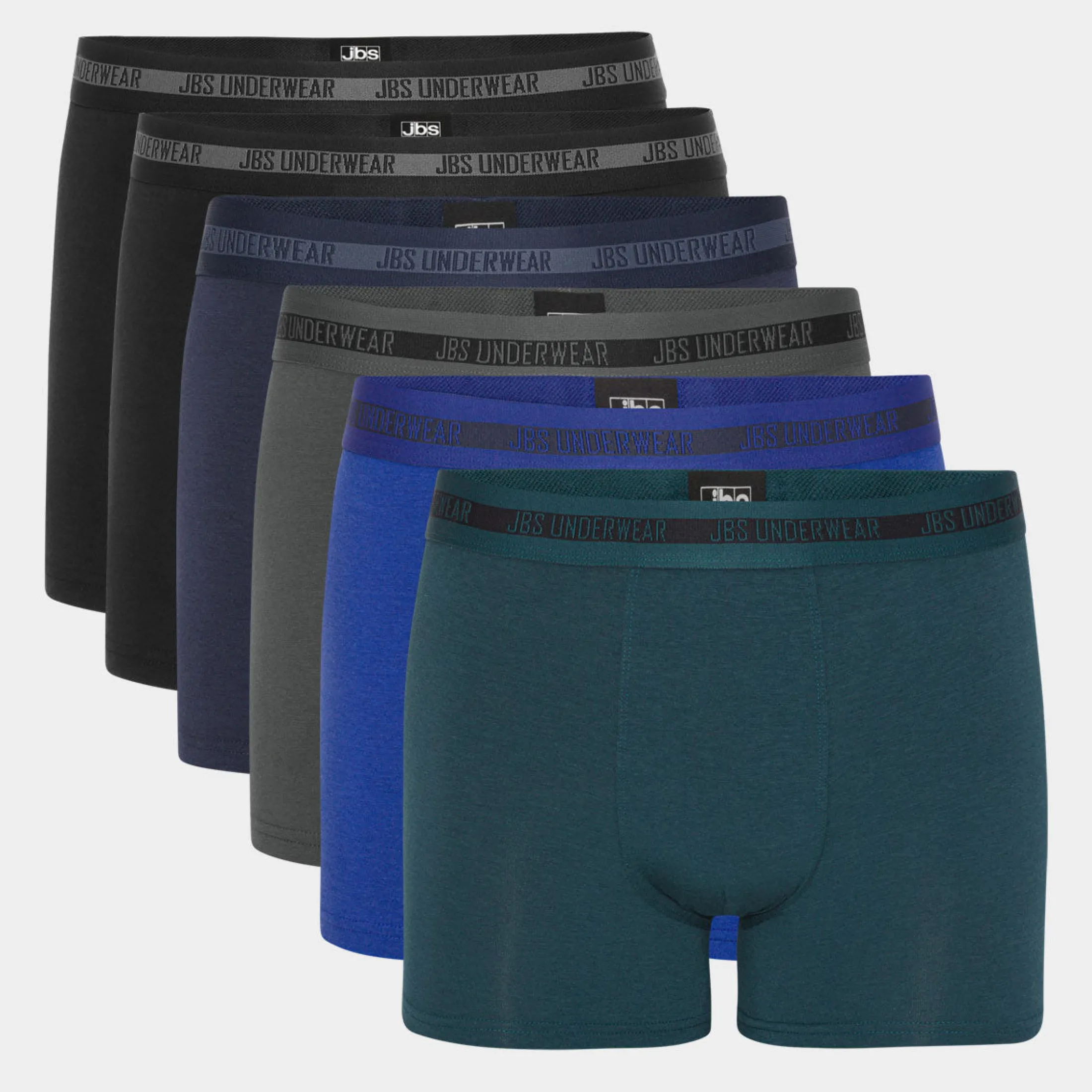 6 pak bambus underbukser fra JBS. 2x sorte, 1x navy, 1x mørkegrå, 1x blå og 1x petrol i super blød bambus. Underbukserne er åndbare og temperaturregulerende, hvilket gør dem behagelige at have på hele dagen.