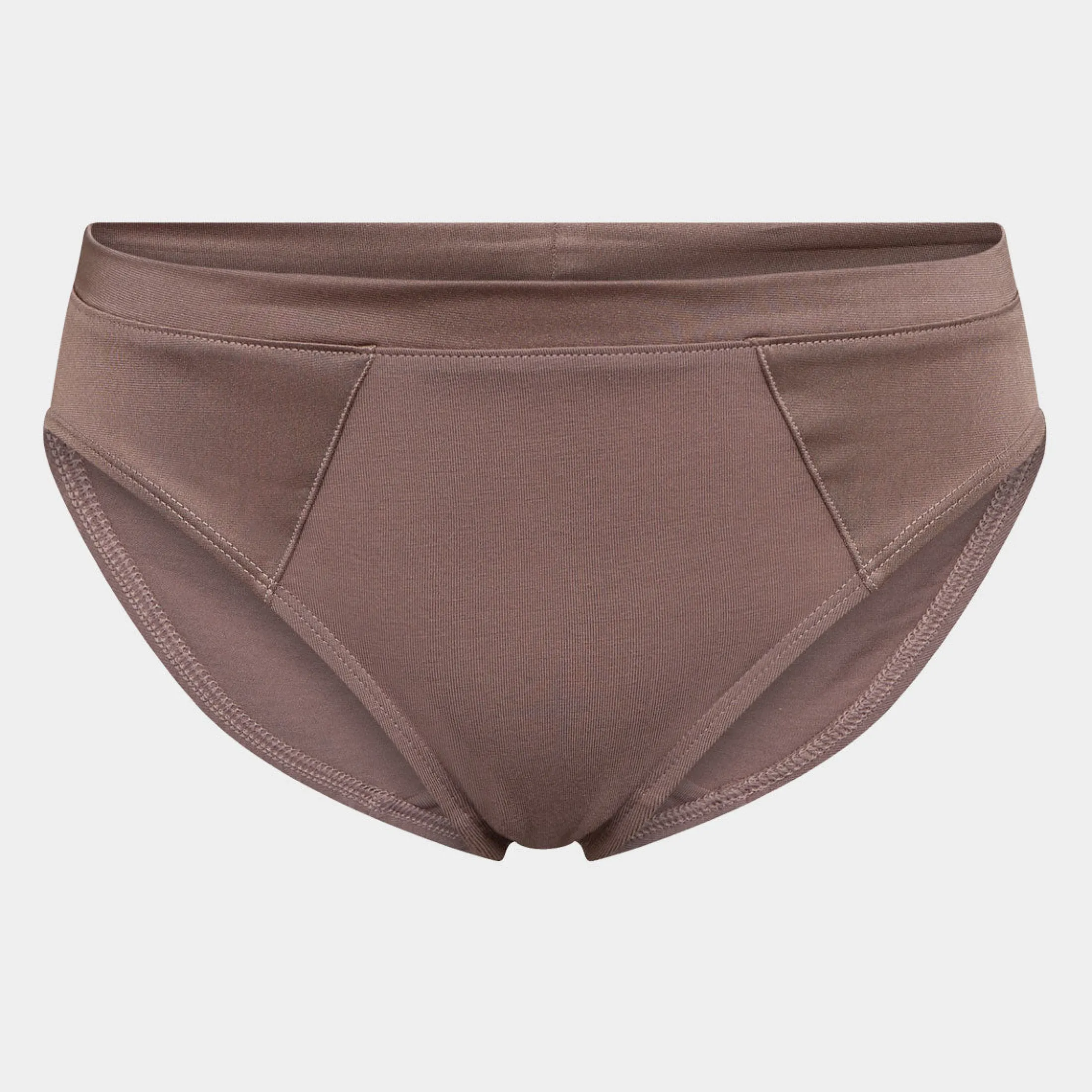 Denne taupe farvede taitrusse i silkeblød bambus viskose fra JBS of Denmark har en påsyet side og linning i en anden vævning, som giver et fint og feminint udtryk.