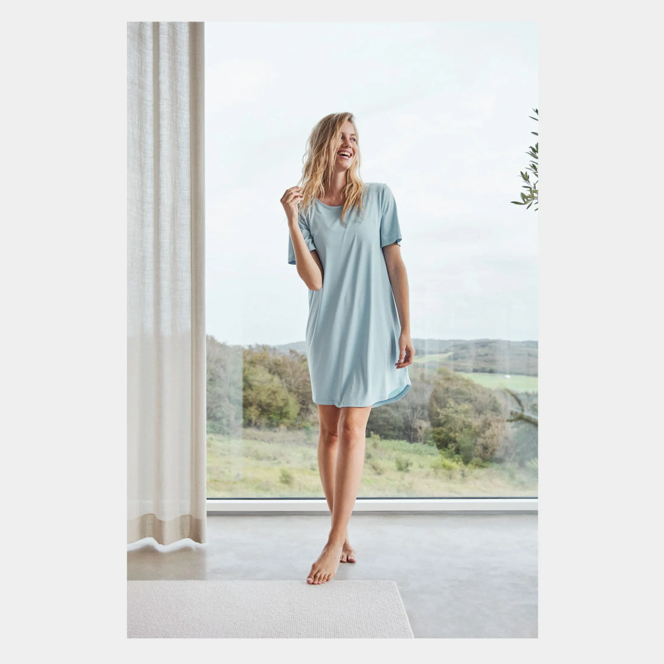 Denne lyseblå T-shirt kjole fra JBS of Denmark, fremstillet i blødt bambusmateriale, er alsidig; den kan både fungere som en behagelig og åndbar natkjole eller som en del af et afslappet outfit sammen med leggings eller jeans.