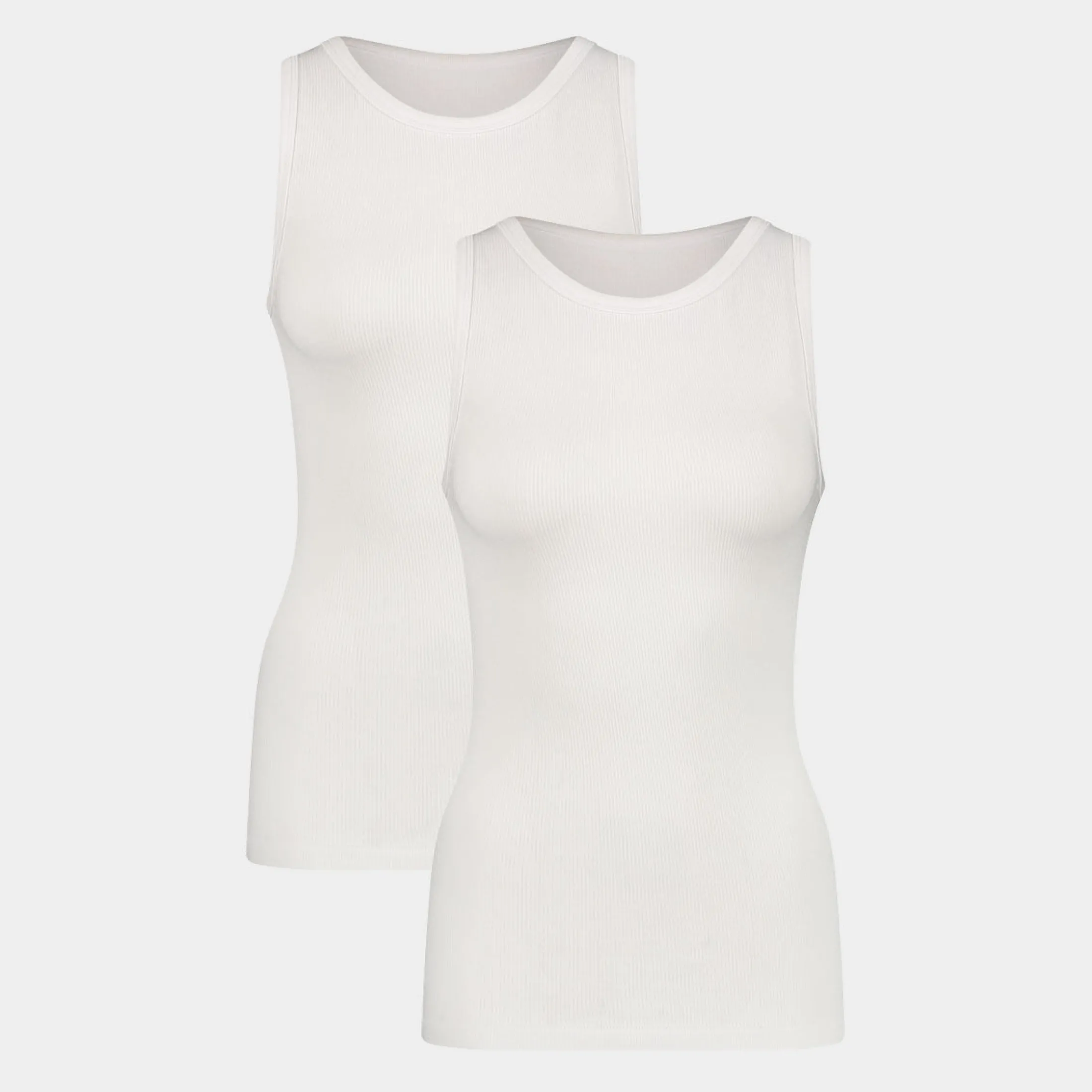 2 hvide rib tank tops i silkeblød bambus. Ribstrikken giver naturlig stræk, hold og komfort. Toppen har påsyet kant i halsudskæring og ærmegab og den nederste kant er vævet ud i et med toppen.