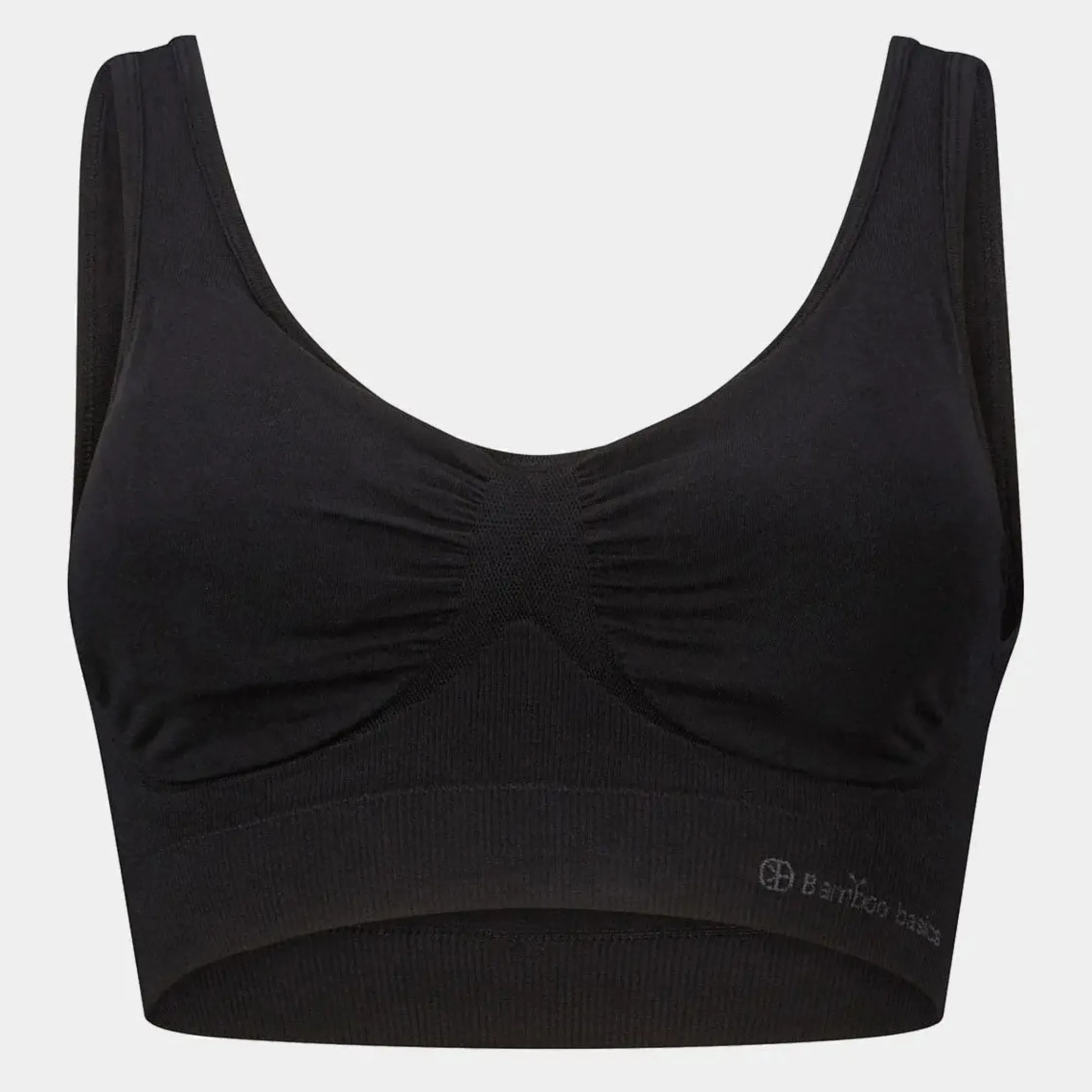Super blød sort vatteret bambus BH uden bøjle, og med brede stropper. Linningen er vævet i et med bh’en, der er inden sidesømme og udskæringerne har en smal påsyet, foldet kant. De bløde bambus fibre er åndbare og temperaturregulerende, hvilket gør materialet perfekt til BH’er.