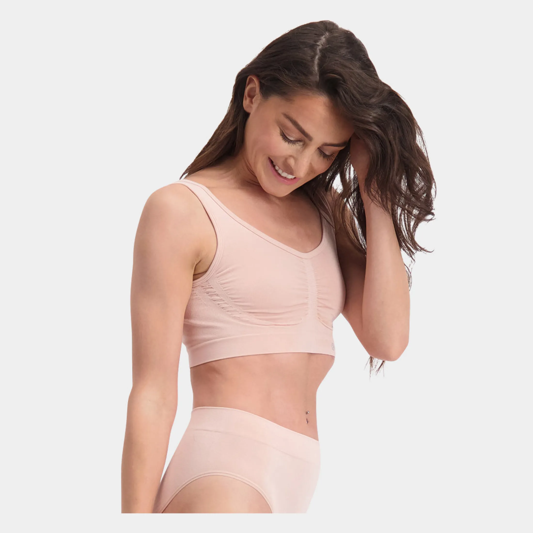 2 stk. super bløde rose nude bambus BH uden bøjle og polstring, og med brede stropper. Linningen er vævet i et med bh’en, der er inden sidesømme og udskæringerne har en smal påsyet, foldet kant. De bløde bambus fibre er åndbare og temperaturregulerende, hvilket gør materialet perfekt til BH’er.