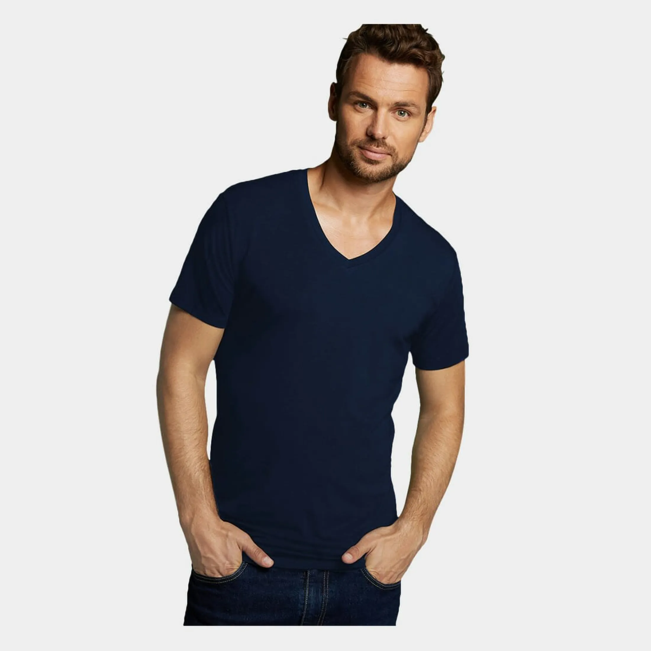 2 stk navy blå T-shirts med v-hals i bambus fra Bamboo Basics. Det silkebløde bambus gør T-shirten perfekt til brug under fx en skjorte, da den er åndbar, svedtransporterende og temperaturregulerende.
