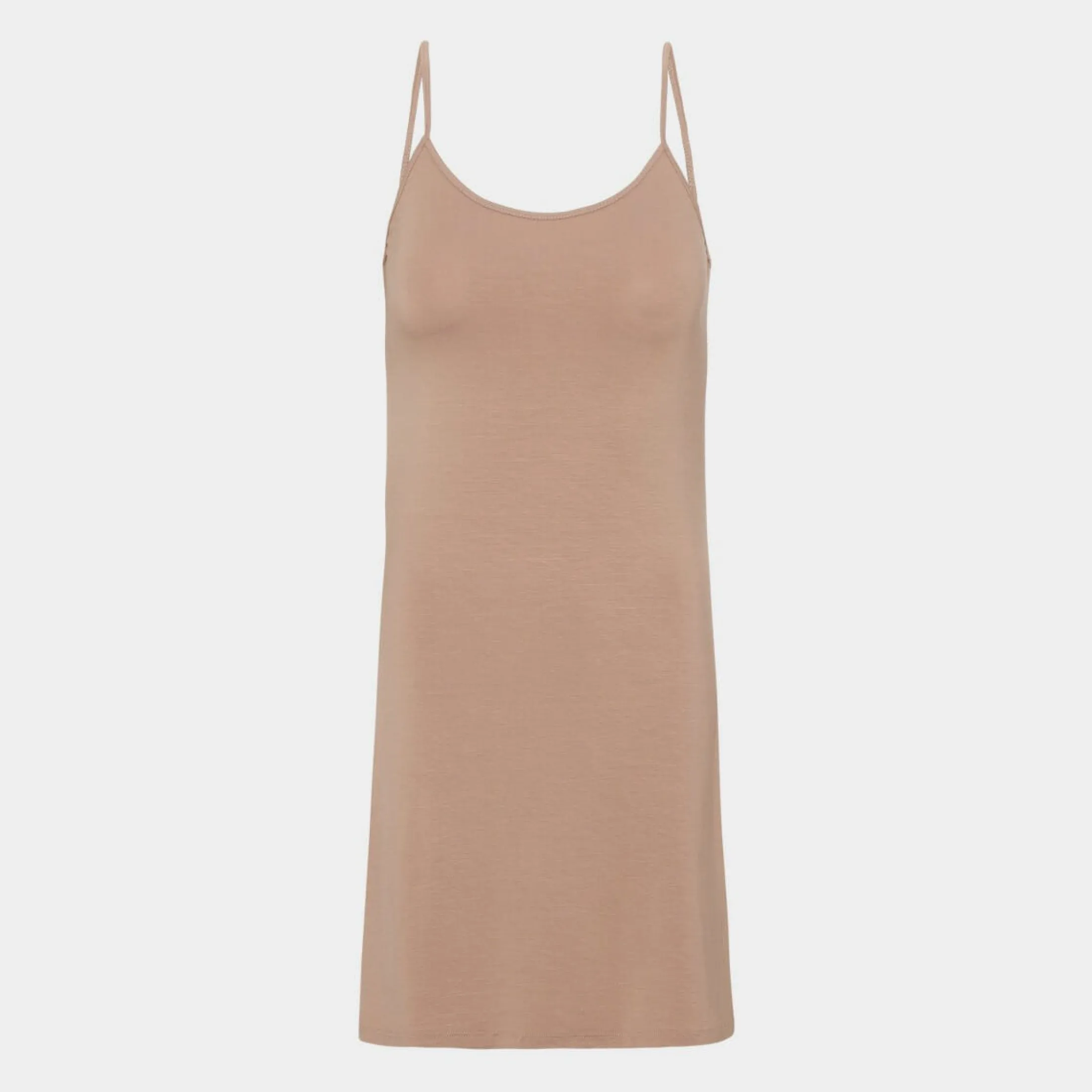 Super blød og komfortabel underkjole i bambus fra Boody. Perfekt til at have på under dine lyse kjoler eller bare til at slappe af i derhjemme. Den har en løs pasform, spaghettistropper og går til midt på låret.