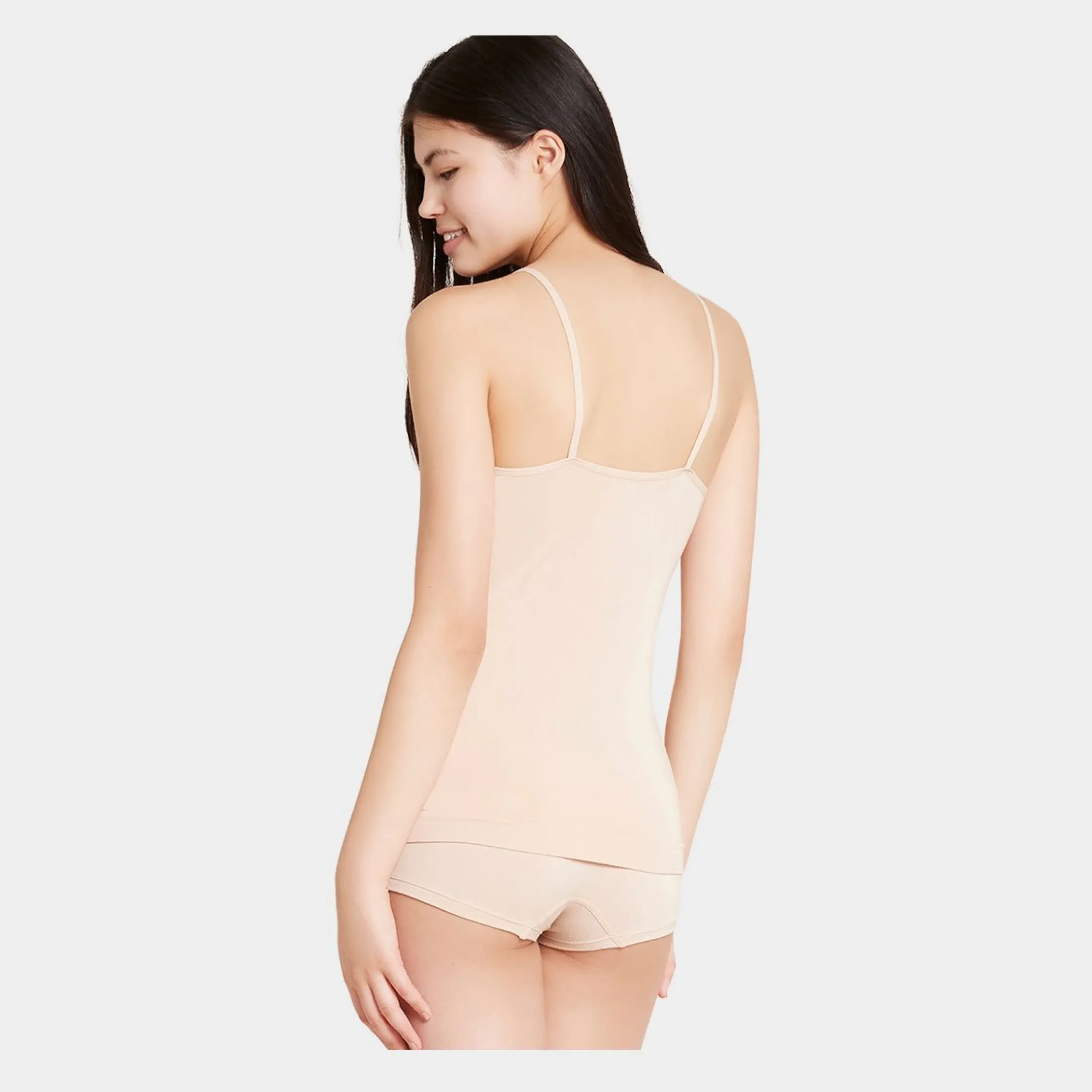 Yderst behagelig rose nude, sømløs og tætsiddende bambus top med tynde stropper. Den kan bruges både som undertrøje og som top sammen med et par jeans.