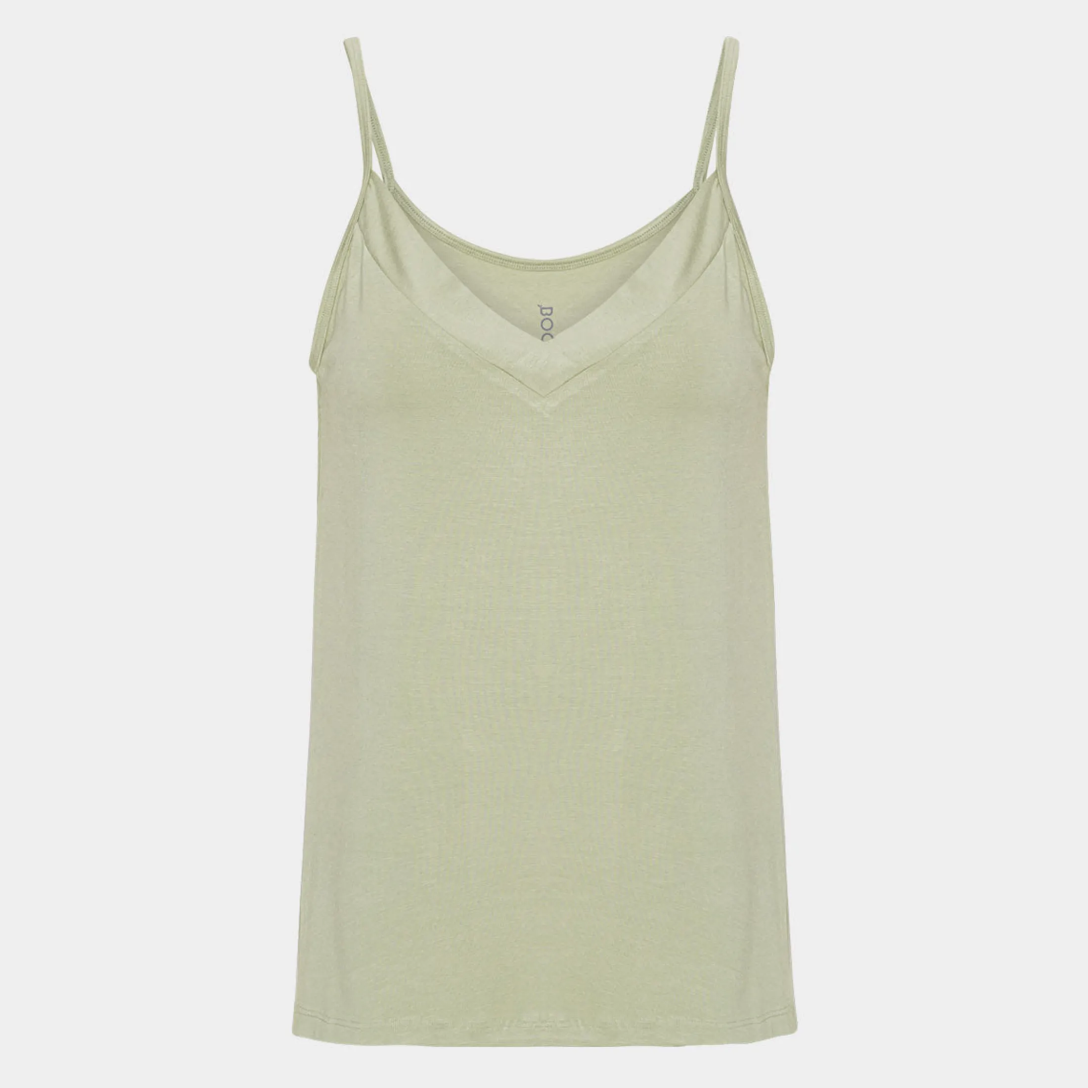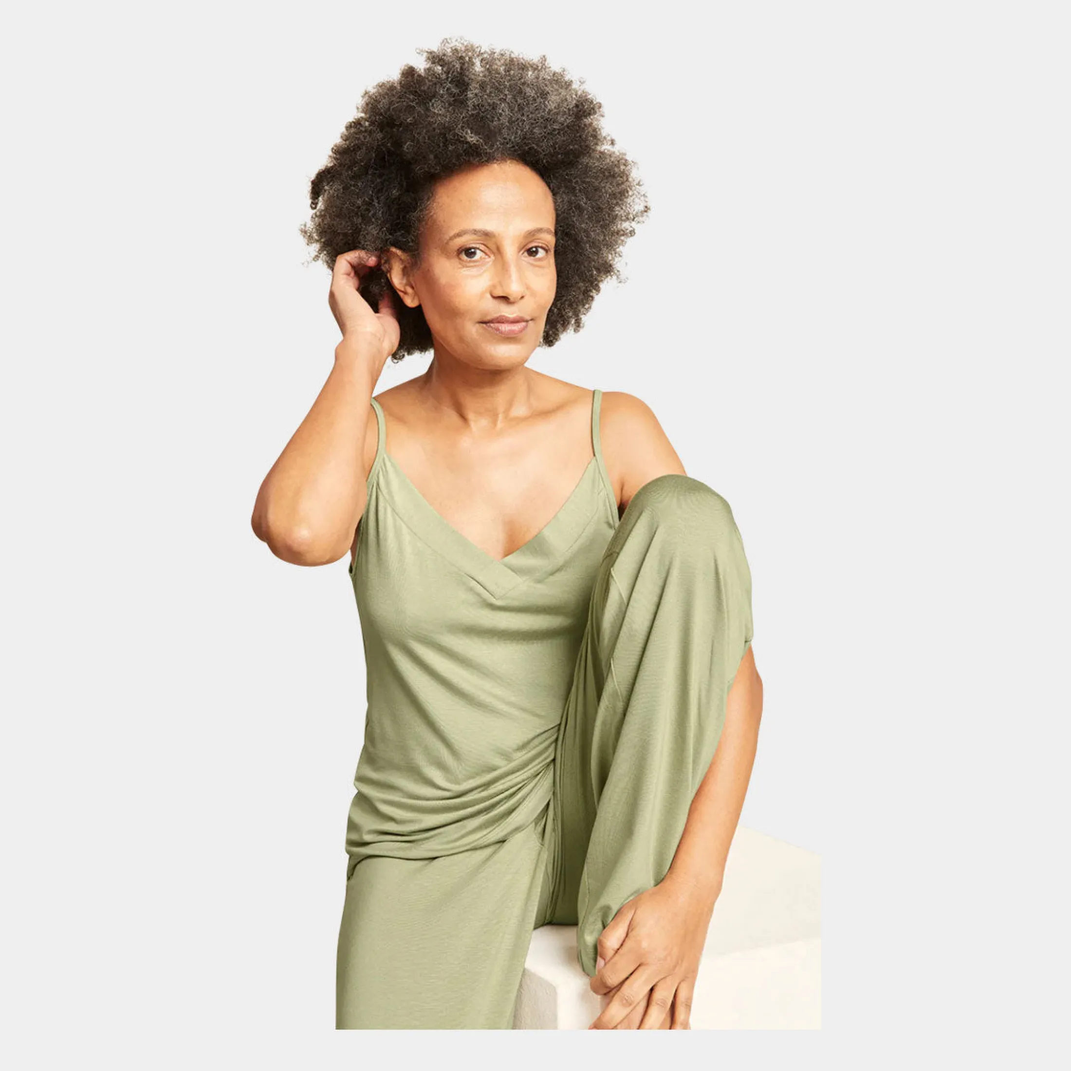 Denne lysegrønne bambus nattop fra Boody har spaghettistropper og en flot v-udskæring med krydsende bånd. Toppen er med sin løse pasform og kurvede søm perfekt både til hygge derhjemme eller sammen med et par shorts på en varm sommerdag.
