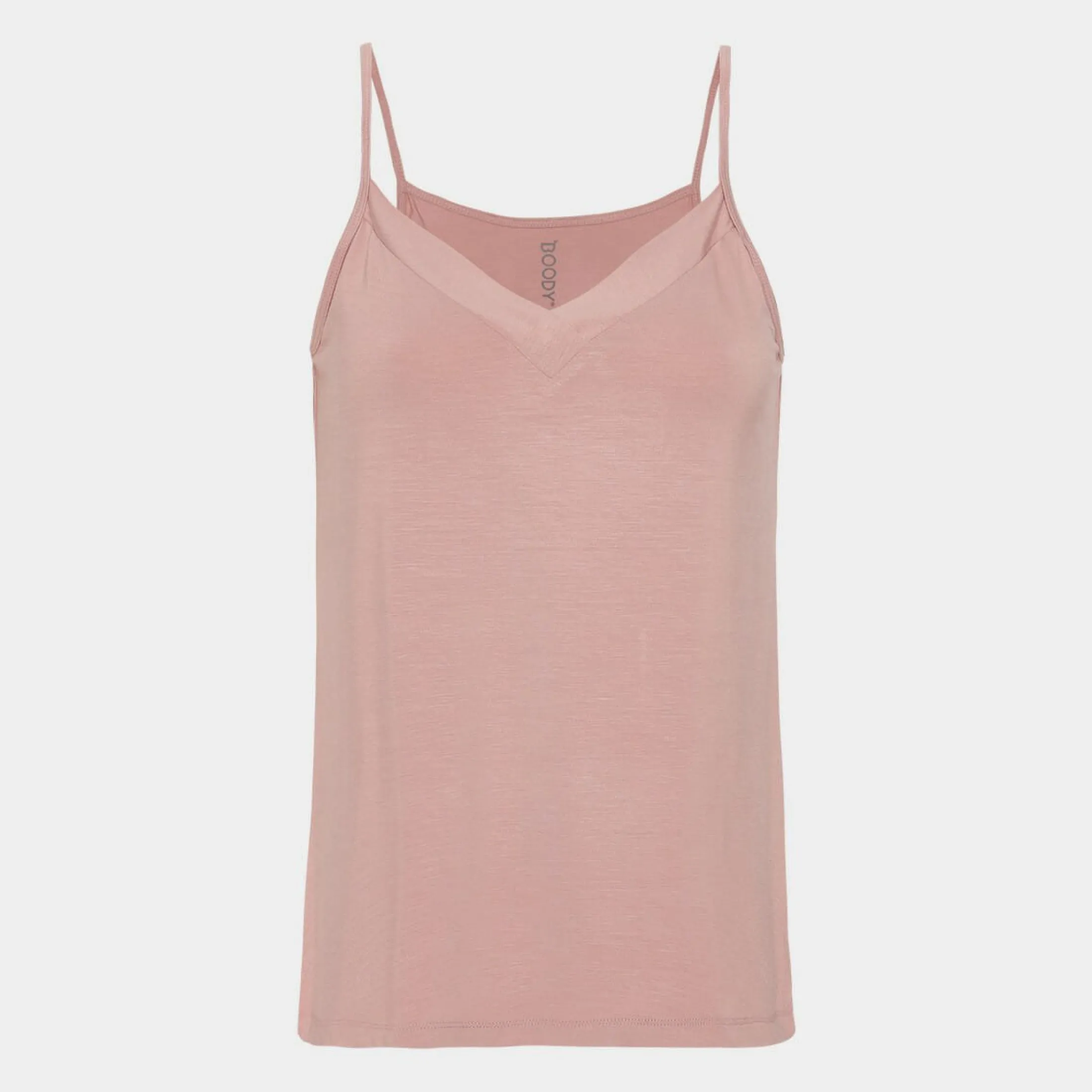 Denne bambus nattop fra Boody har spaghettistropper og en flot v-udskæring med krydsende bånd. Toppen er med sin løse pasform og kurvede søm perfekt både til hygge derhjemme eller sammen med et par shorts på en varm sommerdag.
