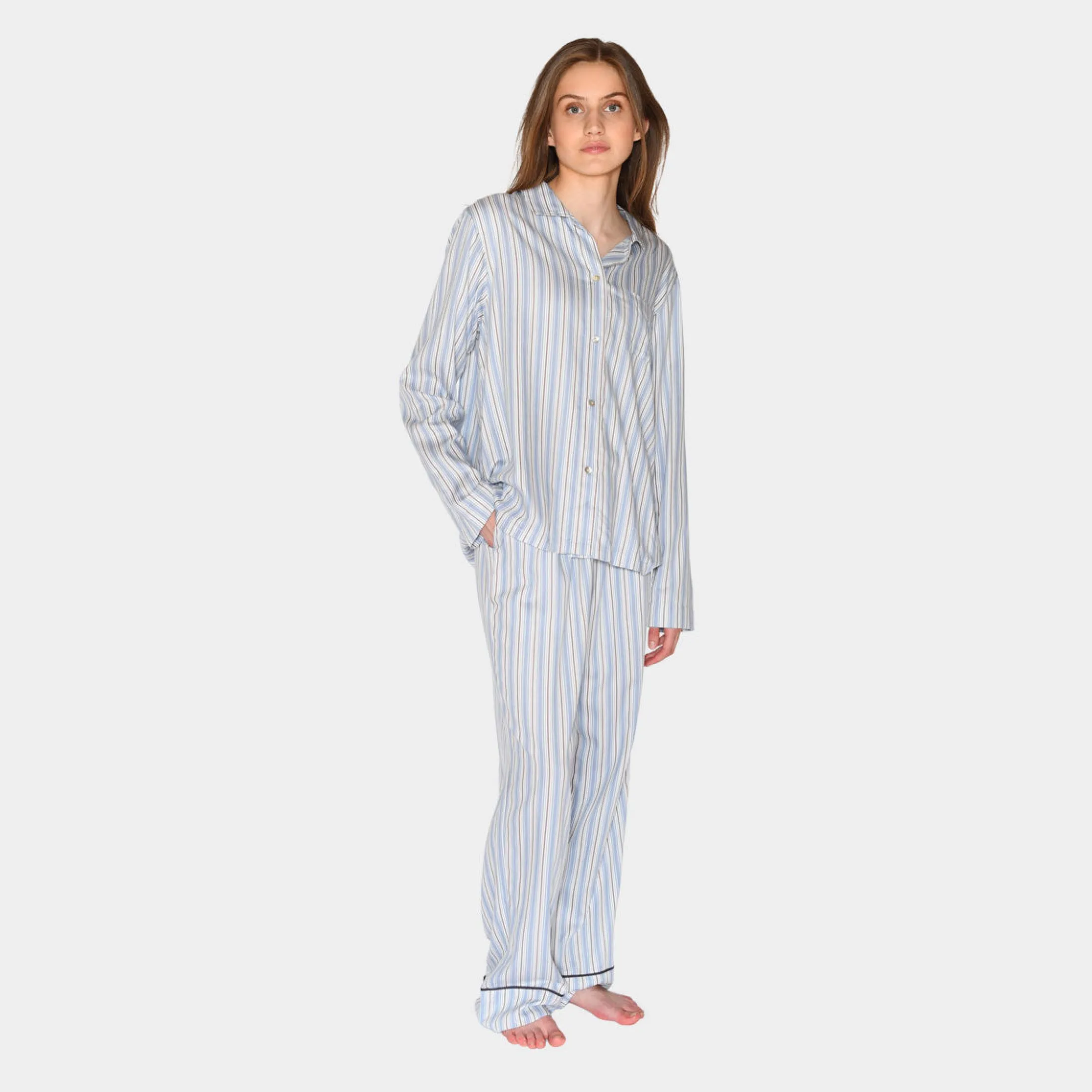 Sød natskjorte med blå, hvide og grå striber fra CCDK. Natskjorten har brystlomme, klassisk skjortekrave og lukkes med fine perlemorsknapper.
