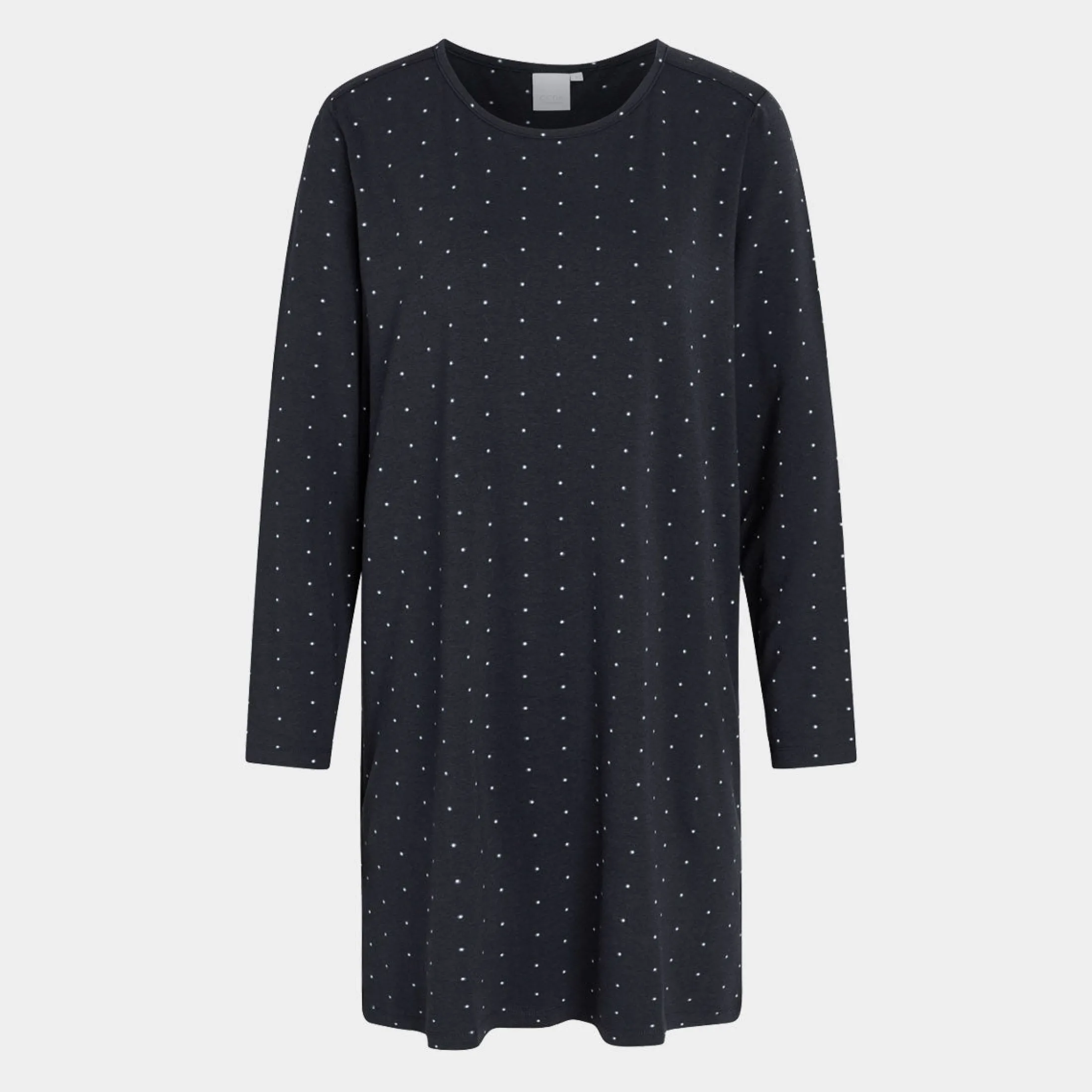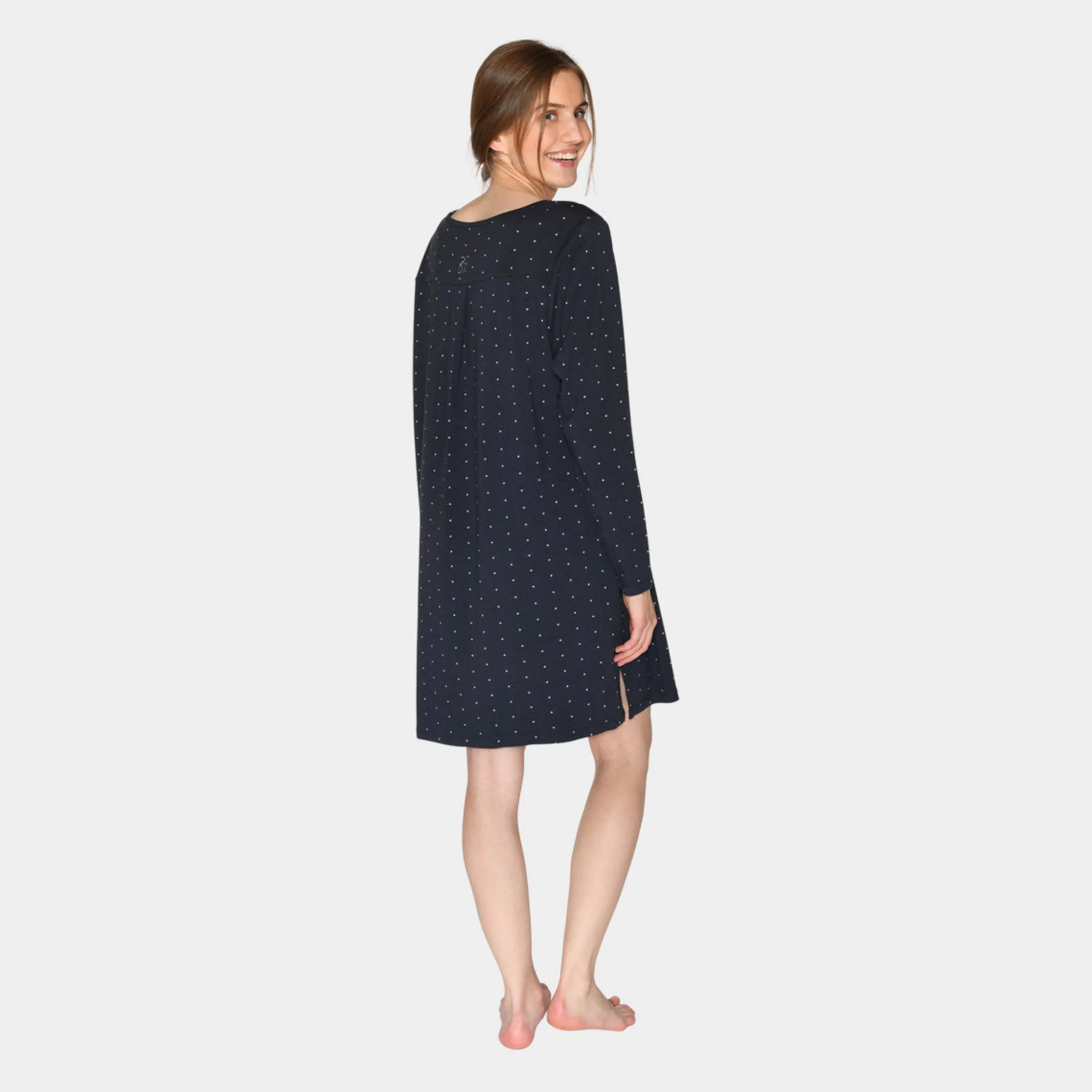 Denne flotte langærmede bambus natkjole i navy med prikker, er dejlig kraftig i kvaliteten. Perfekt til kølige nætter og hyggelige søndage hjemme. Bambus er åndbart og temperaturregulerende, hvilket gør det perfekt til at sove i uden at få det alt for varmt eller koldt.
