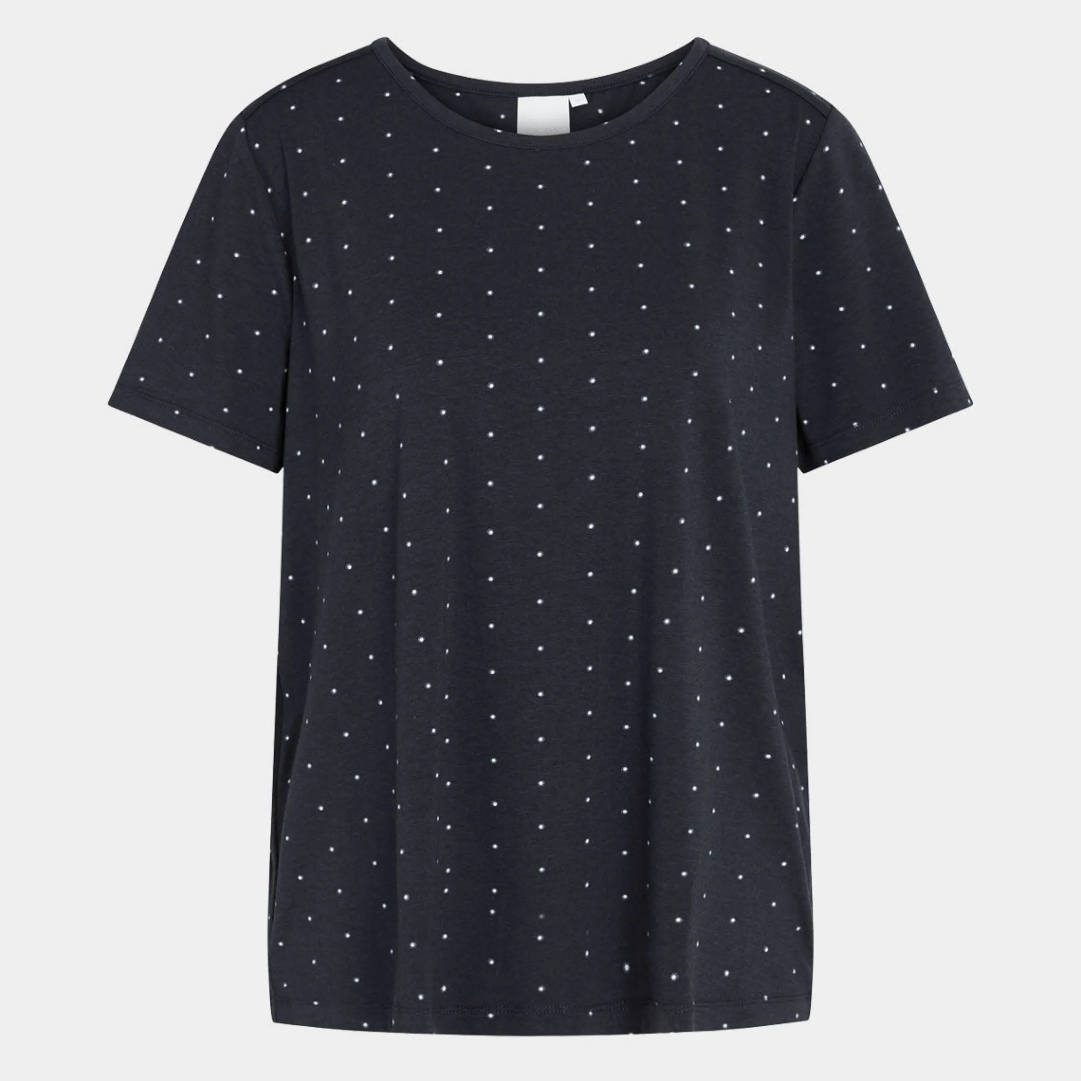 Denne kortærmede T-shirt fra CCDK er designet i en klassisk navy med fine små prikker. Den er fremstillet af en lækker blanding af bambus og økologisk bomuld, som giver blødhed, åndbarhed og temperaturregulerende egenskaber. Et ideelt valg til din basisgarderobe; perfekt til afslapning eller en komfortabel nats søvn.