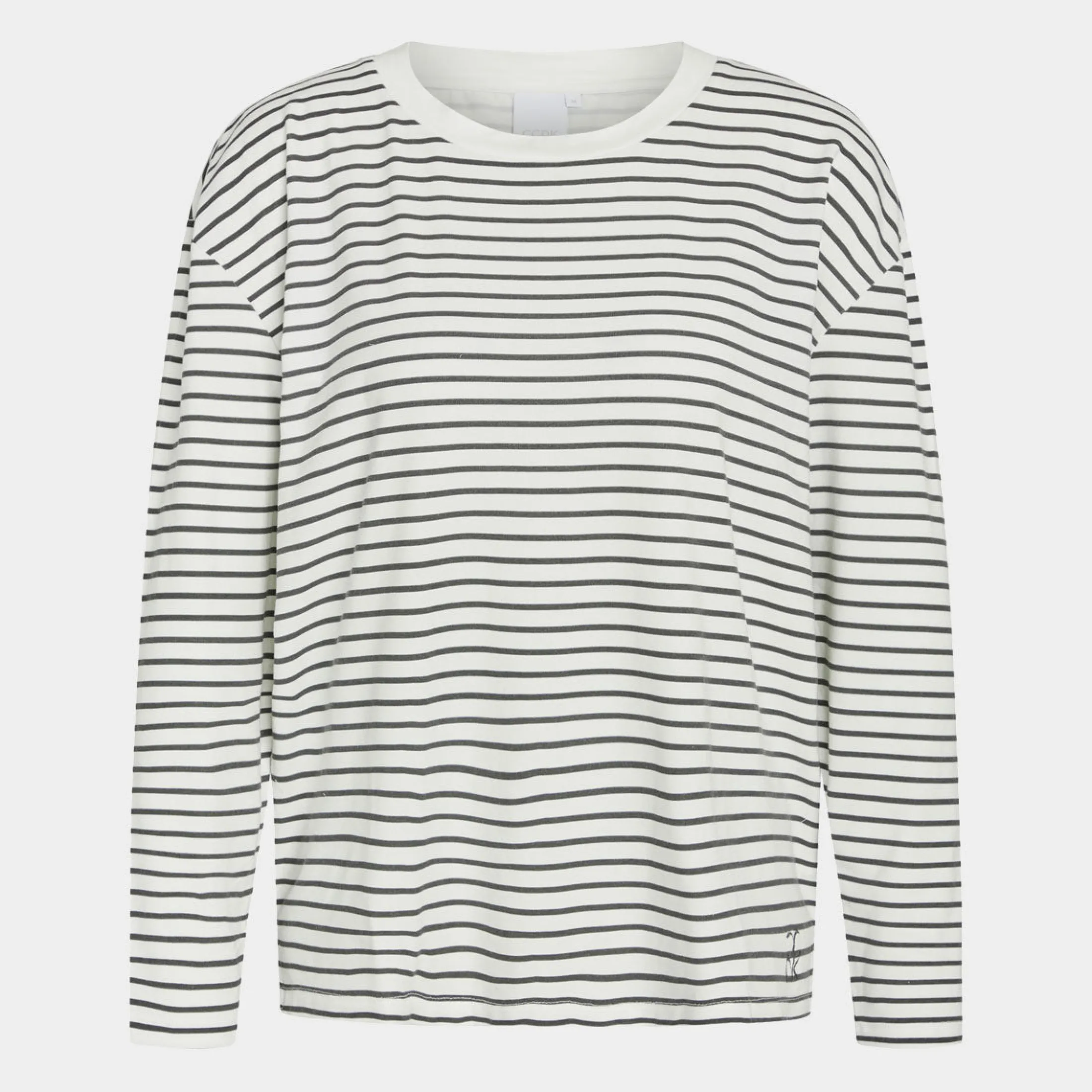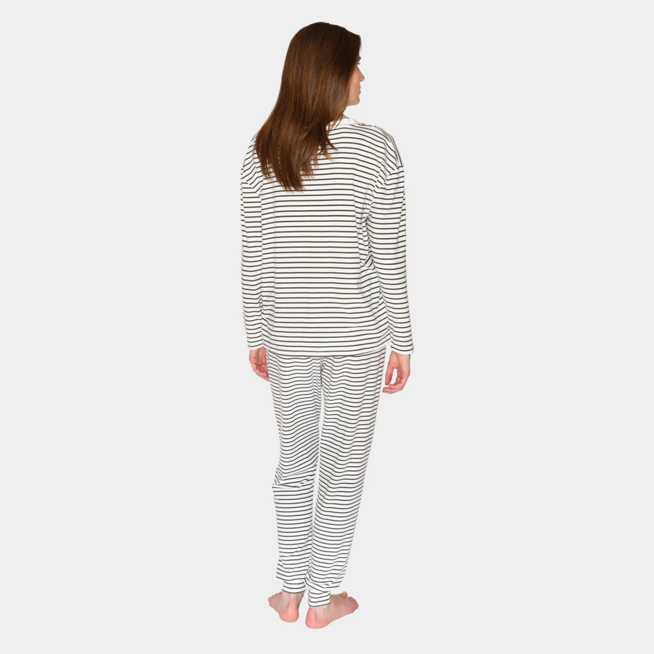 Sød langærmet bambus nattrøje i hvid med grå striber, fra CCDK. Perfekt til kølige nætter og hyggelige søndage hjemme.