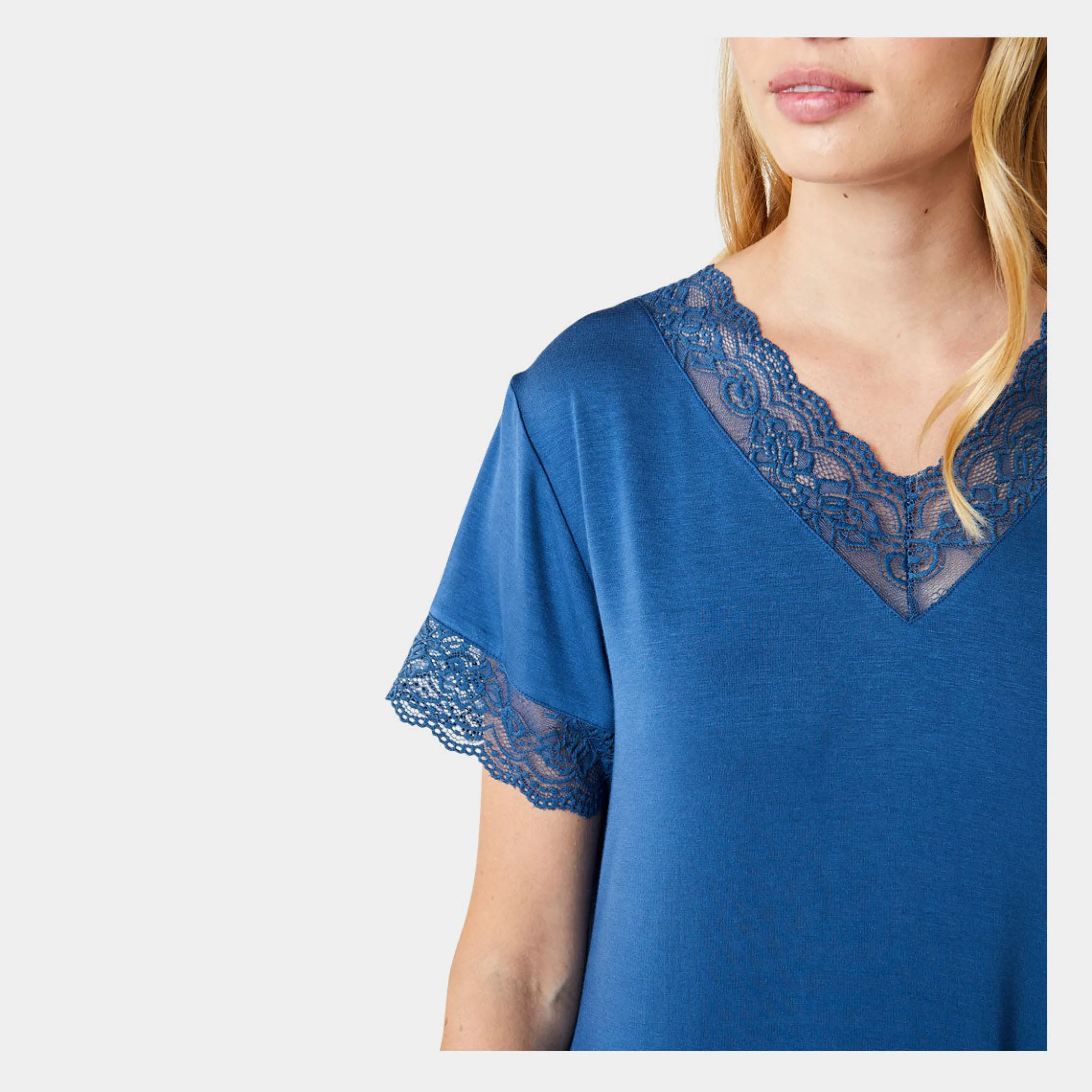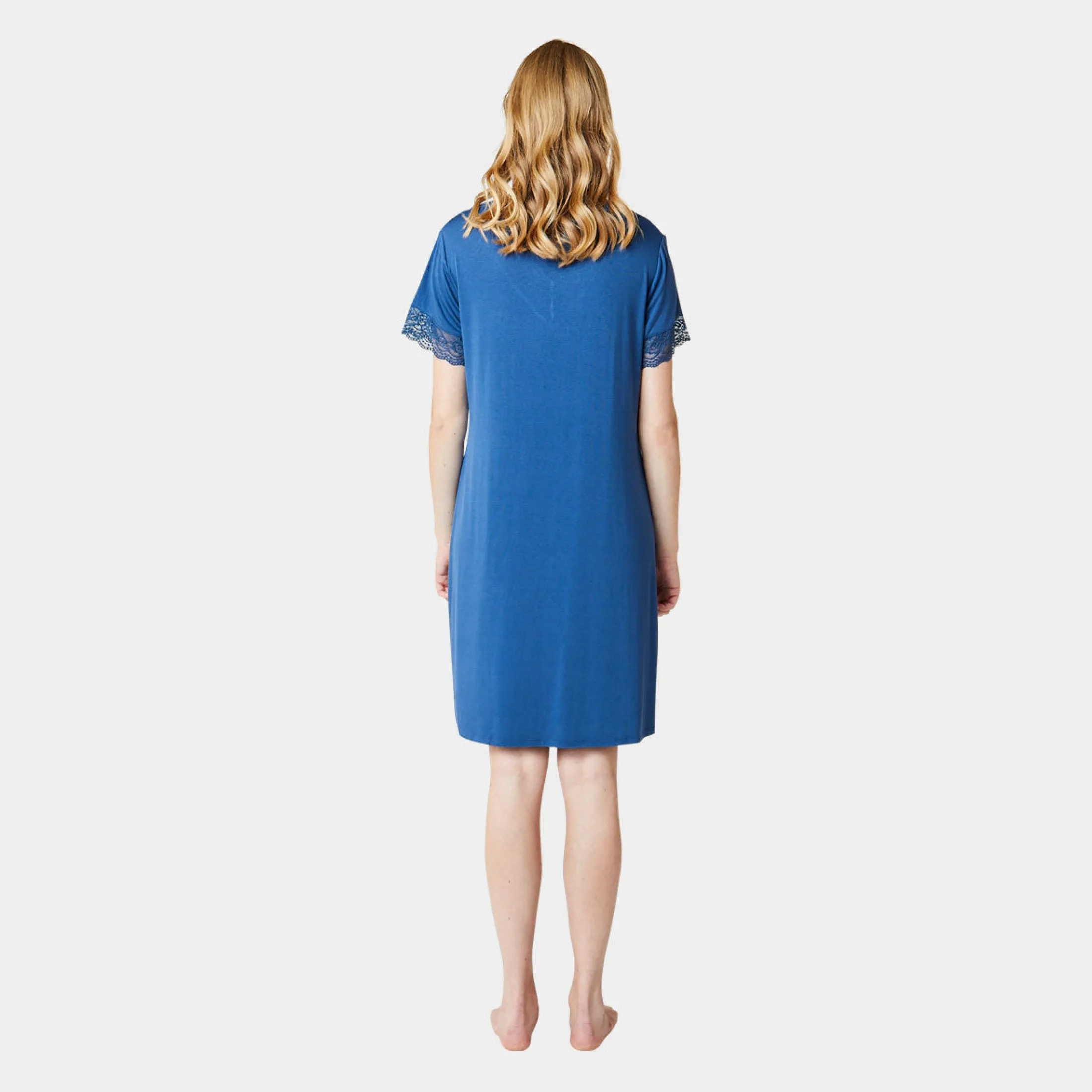 Feminin bambus natkjole med korte ærmer i støvet blå. Natkjolen har en v-hals udskæring med en bred blondekant, samt en bred blondekant på begge ærmer.