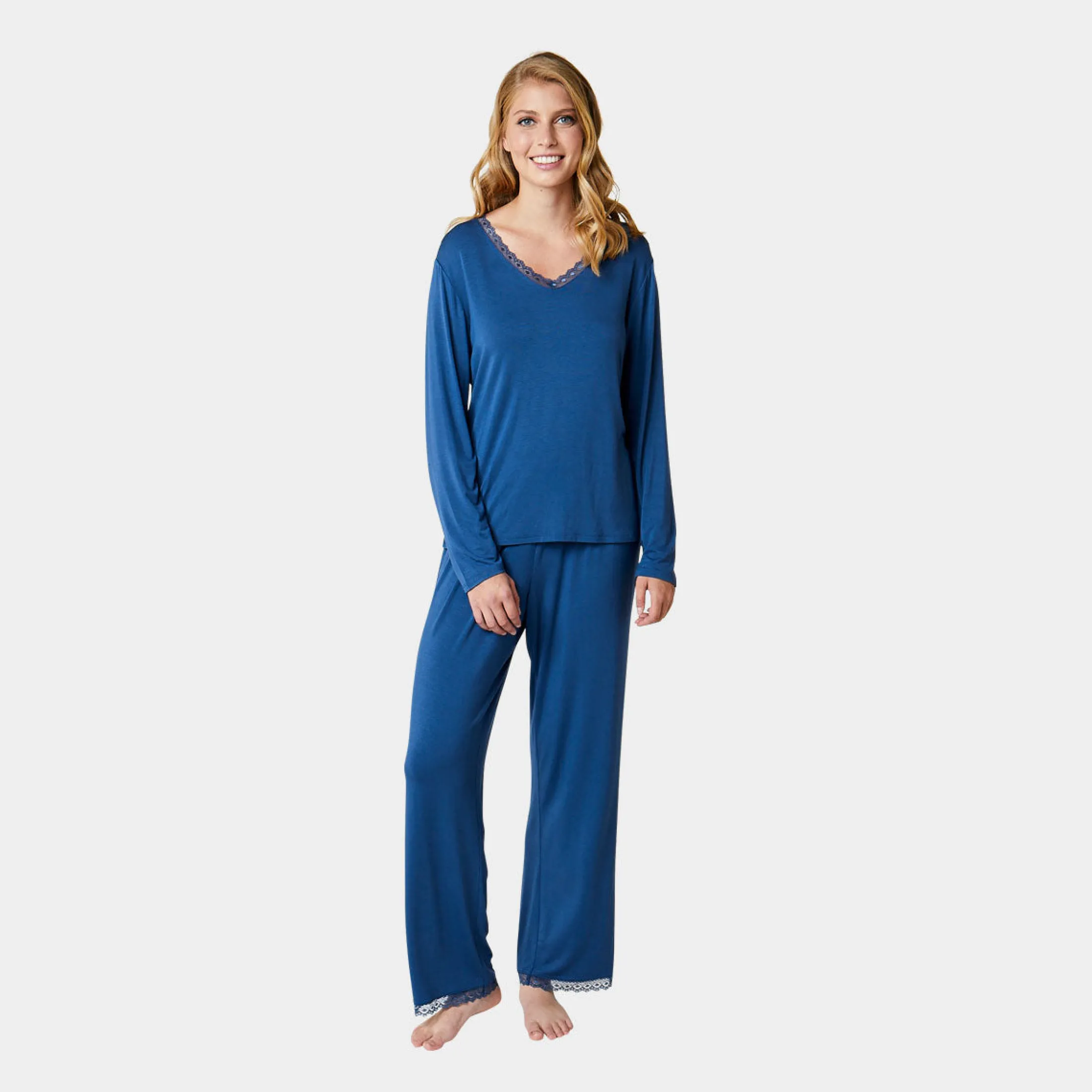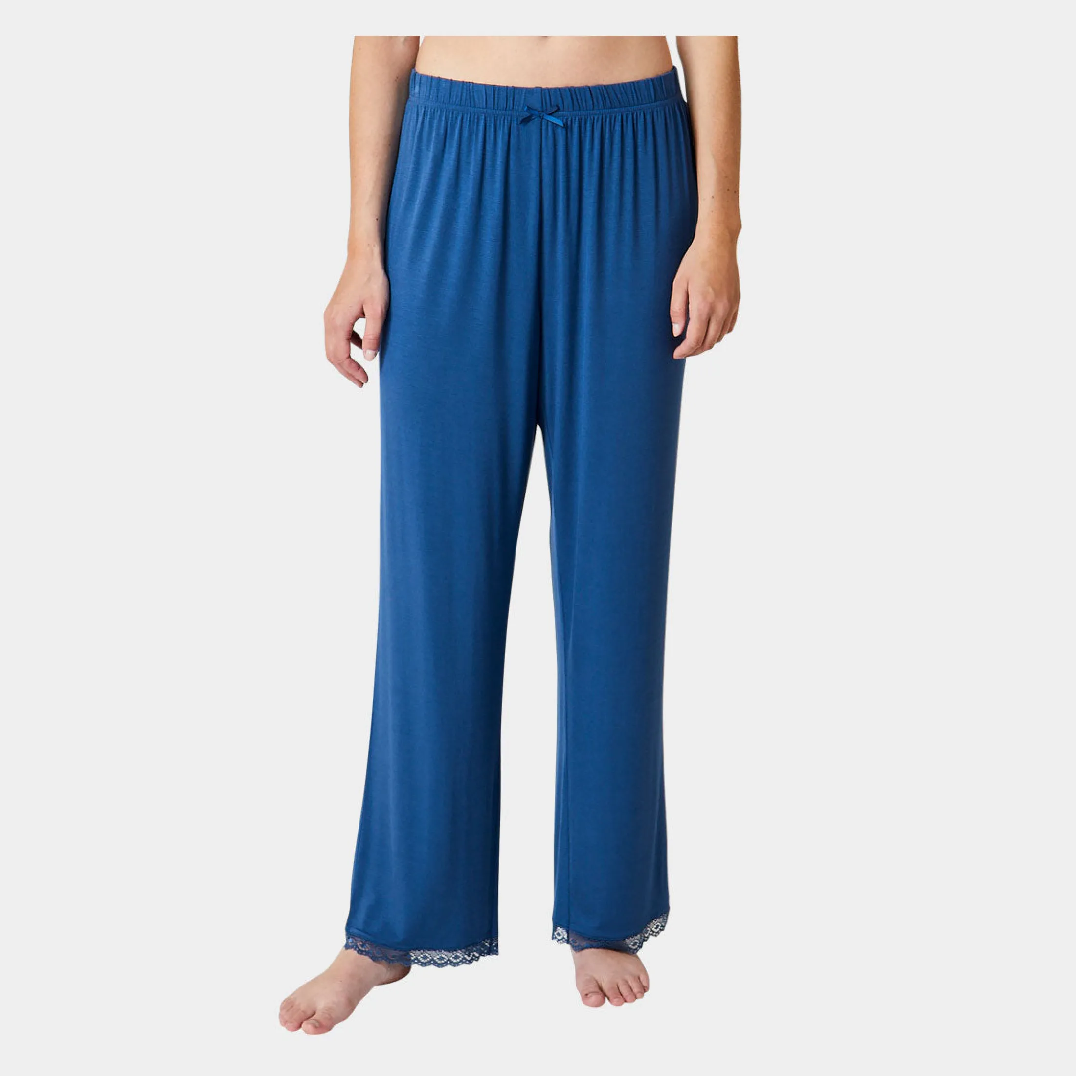 Feminine bambus natbukser i støvet blå. Natbukserne er detaljeret med en smal blondekant nederst på benene, har elastiklinning med en lille påsyet sløjfe i satinbånd.