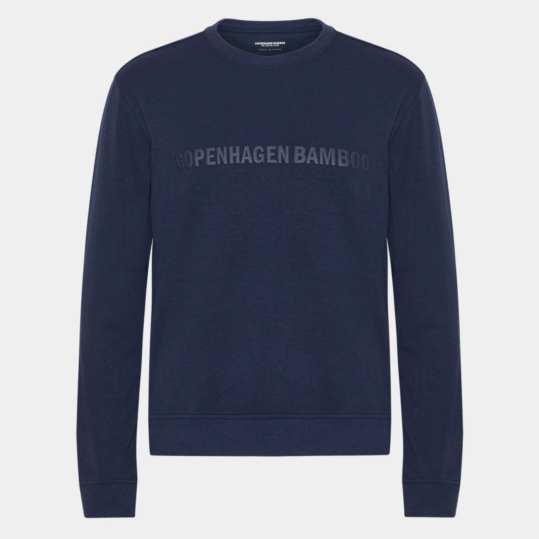 Flot navyblå bambus sweatshirt med logo print hen over brystet. Denne sweatshirt er fremstillet i bambusviskose, økologisk bomuld og polyester.