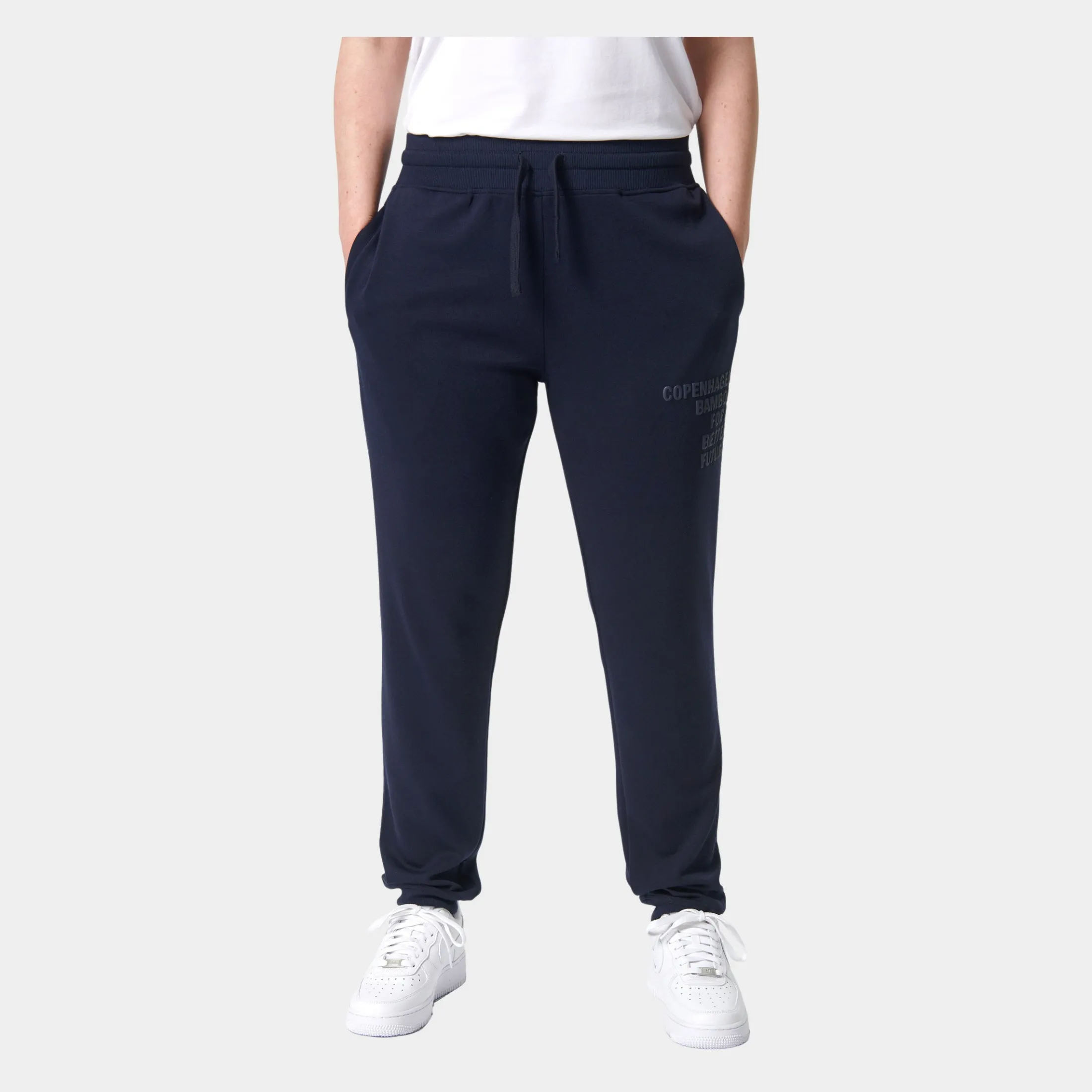 Bløde navyblå bambus sweatpants til kvinder med logo på højre lår. Disse sweatpants har lynlås i lommerne, så du slipper for at pung og nøgler falder ud i løbet af dagen. De er fremstillet i bambusviskose, økologisk bomuld og polyester.
