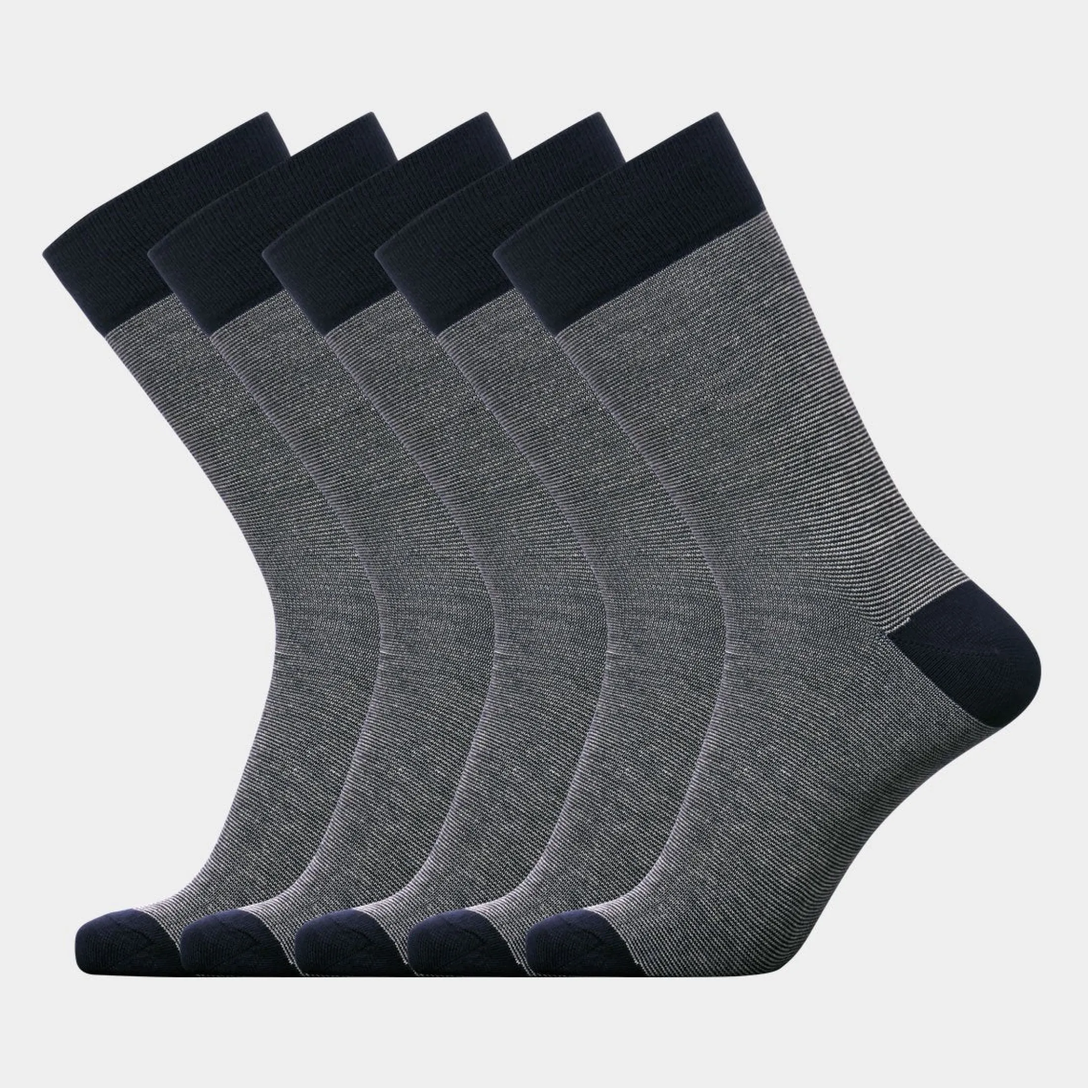 5 par navyblå bambus strømper med striber til mænd, i flot og lækker kvalitet. Strømperne er åndbare og holder dine fødder luftige hele dagen i dine sko.