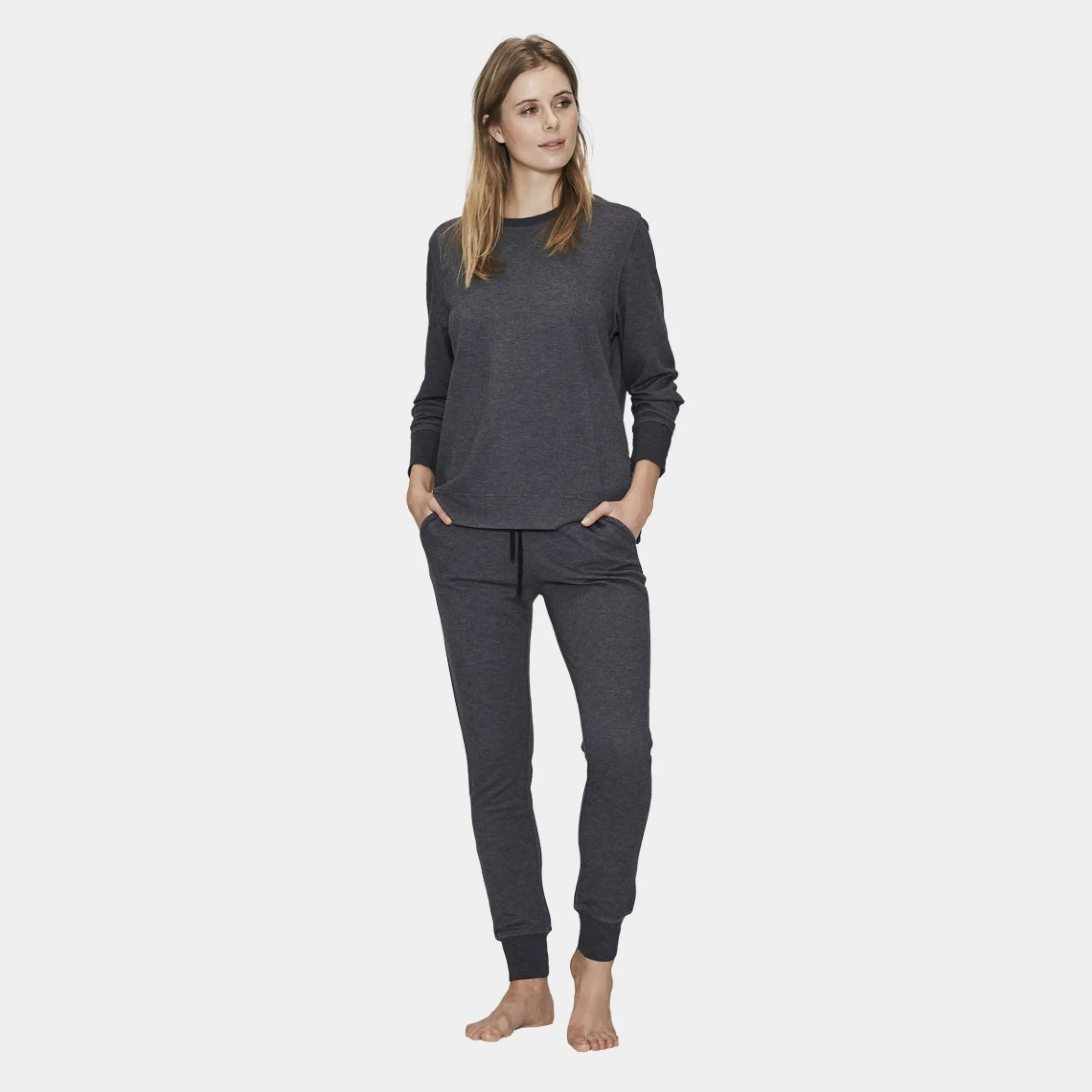 Supper lækkert joggingsæt til damer i mørkegrå fra JBS of Denmark. Det er lavet i bambus, som gør det dejlig blødt og lækkert samt åndbart.