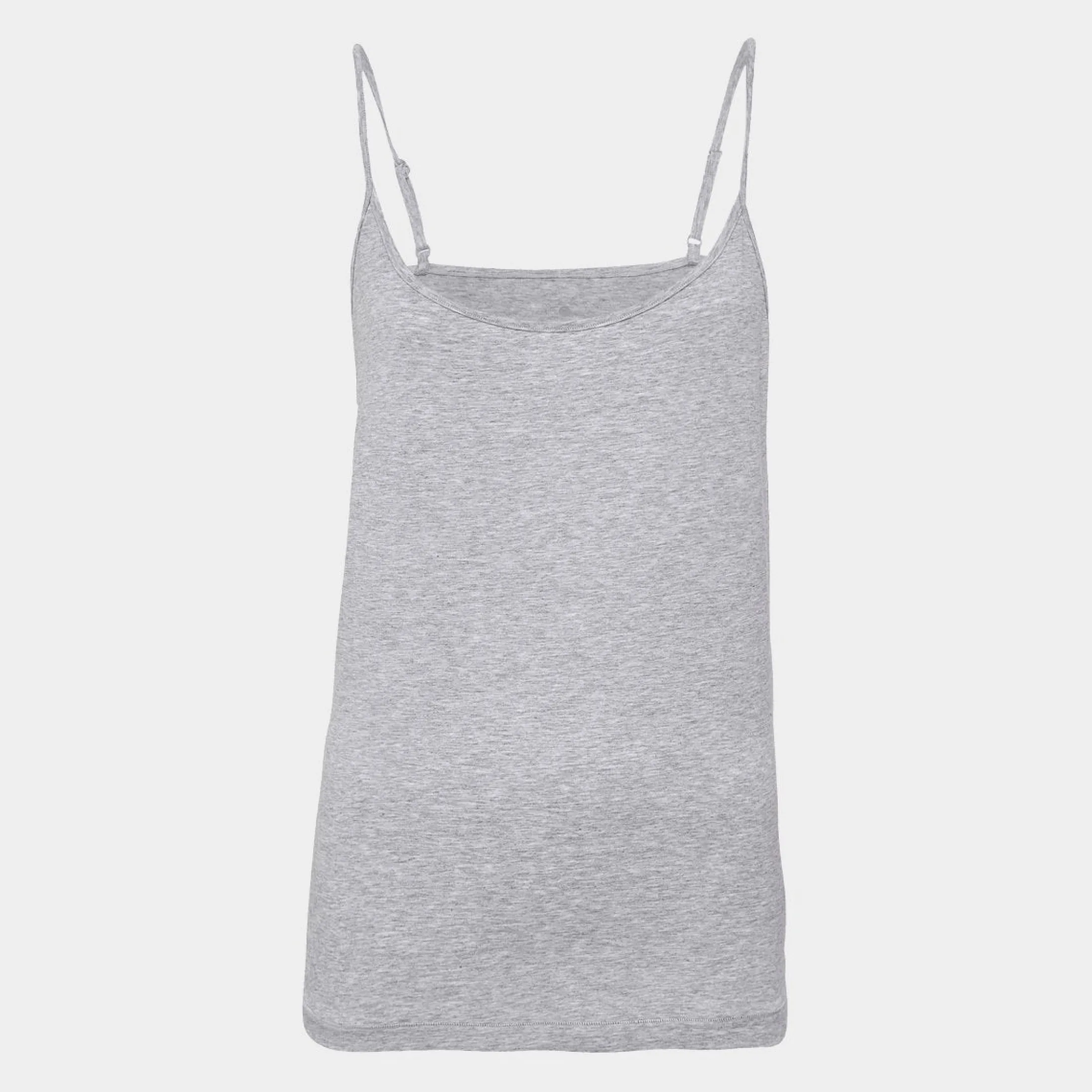 Denne grå basis tank top med tynde stropper er fremstillet af det lækreste bambus materiale. Bambus gør denne top temperaturregulerende, absorberende og ekstrem blød at have på.