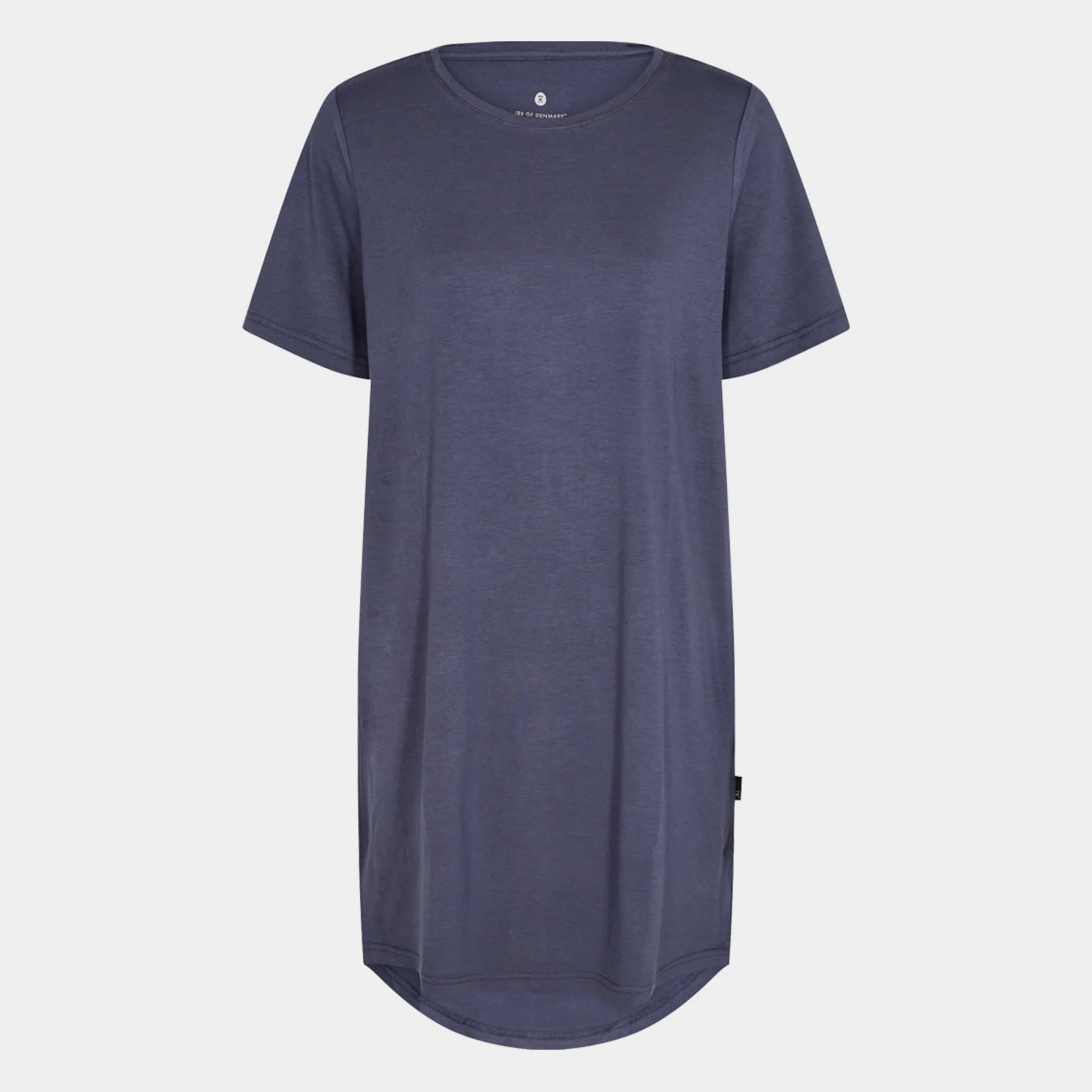 Denne støvet blå T-shirt kjole i bambus fra JBS of Denmark kan bruges både som natkjole eller til et casual look over et par leggings eller et par jeans. Bambus hjælper kroppen med at temperaturregulere, er åndbar og fugttransporterende.