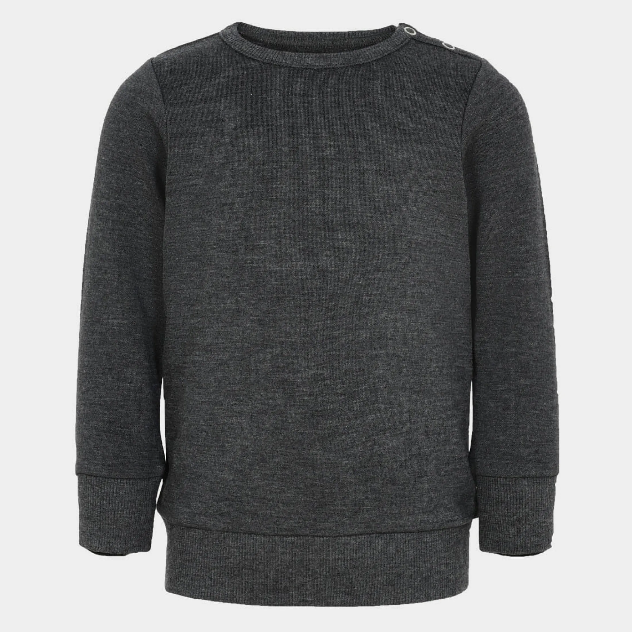 Denne tynde, mørkegrå baby bambus sweatshirt har to trykknapper på venstre skulder, brede manchetter på ærmerne, en bred linning og en rund halsudskæring. Bambus hjælper med at regulere kropstemperaturen, er åndbar, god til sensitiv hud og forbliver blød vask efter vask.