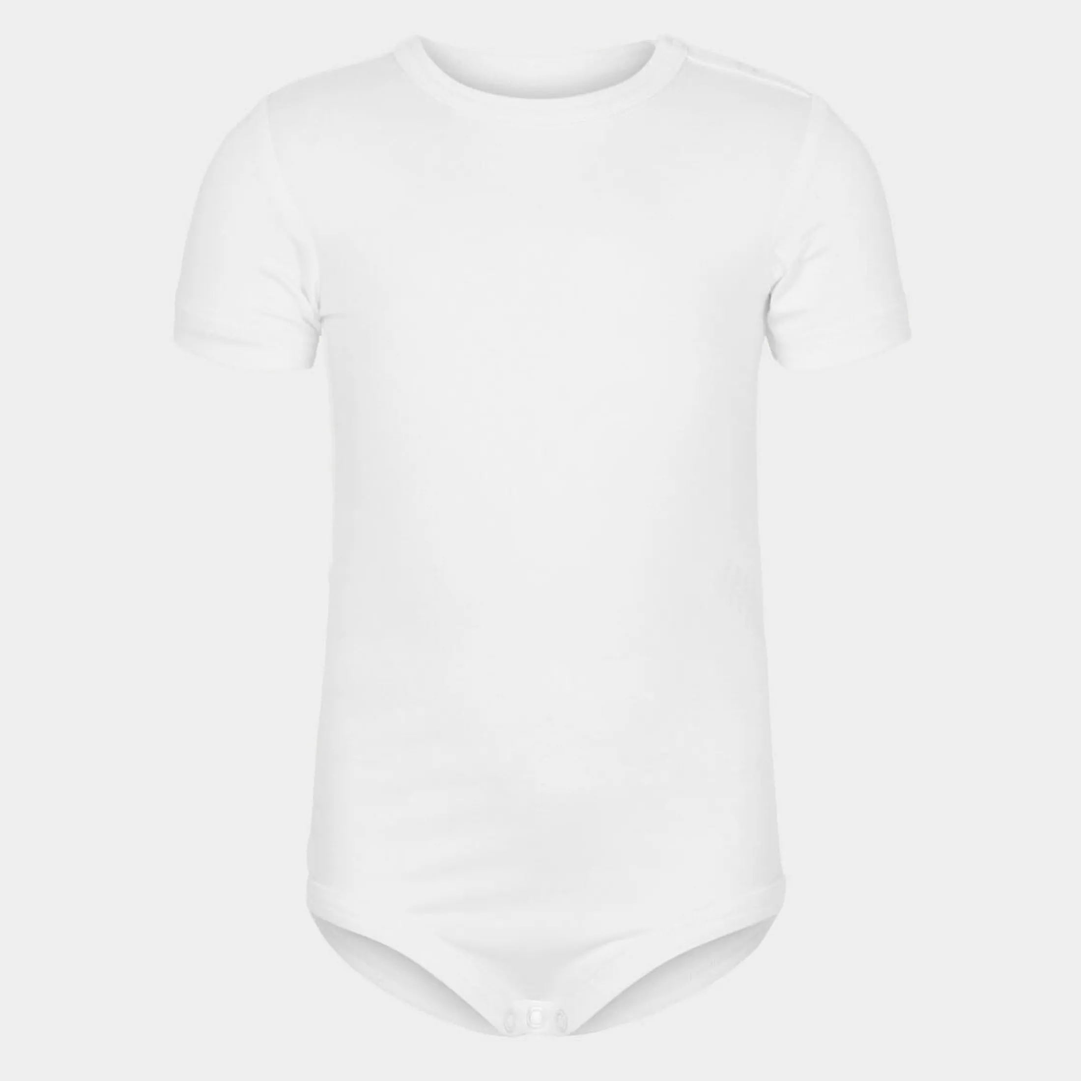 Denne kortærmede hvide body til babyer, som er fremstillet af den blødeste bambus, har to trykknapper på venstre skulder og tre trykknapper i skridtet.