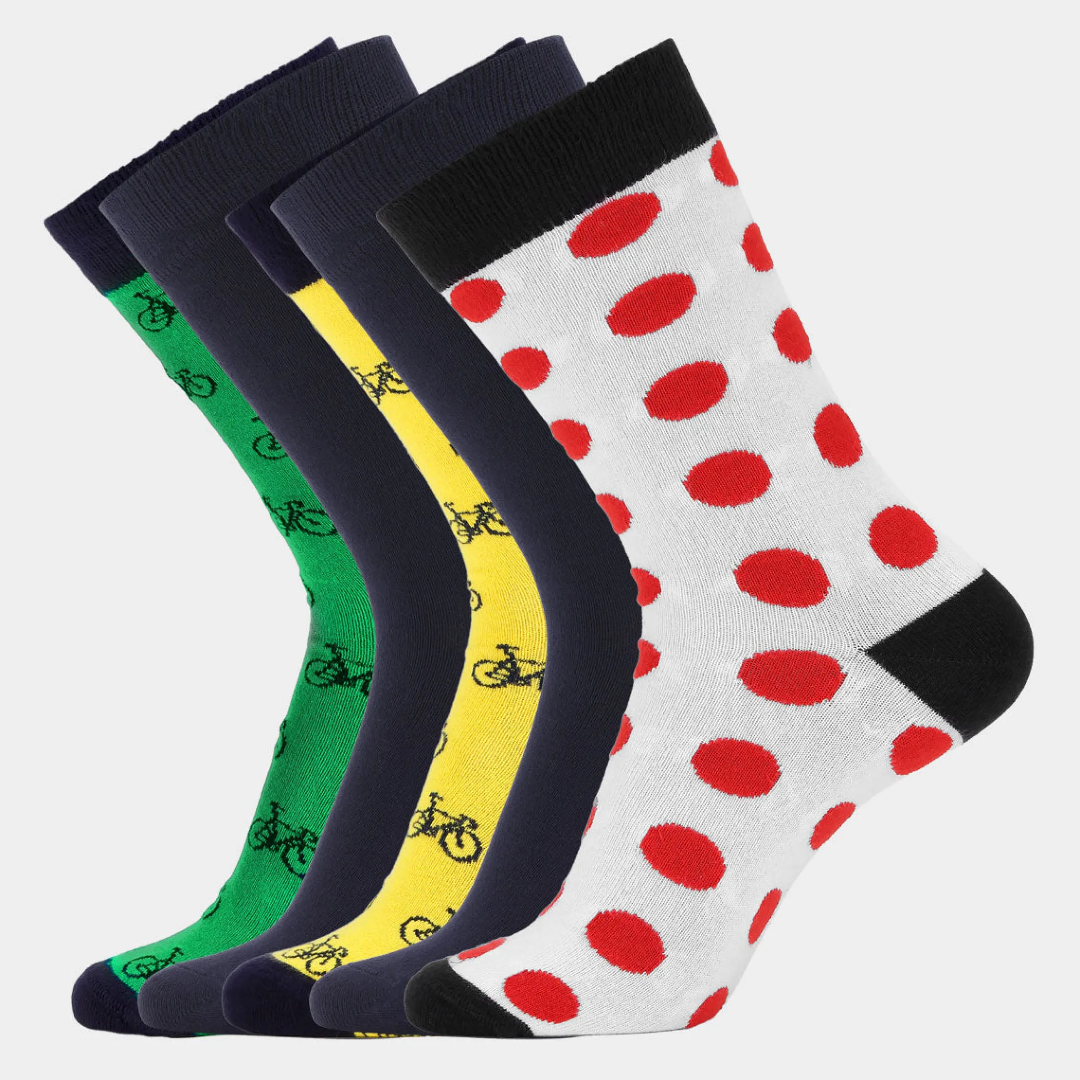 I denne pakke får du 2 par navy, 1 par gule med cykler, 1 par grønne med cykler og et par hvide med røde pletter.